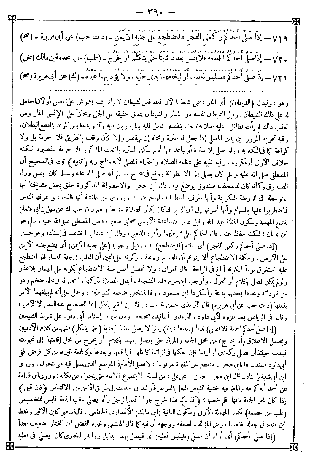 719 - (إذا صلى أحدكم ركعتي الفجر) أي سنته (فليضطجع) ندبا وقيل وجوبا (على جنبه الأيمن) أي يضع جنبه الأيمن على الأرض وحكمة الاضطجاع ألا يتوهم أن الصبح رباعية وكونه على اليمين أن القلب في جهة اليسار فلو اضطجع عليه استغرق نوما لكونه أبلغ في الراحة. قال العراقي: ولا تحصل أصل سنة الاضطجاع بكونه على اليسار بلا عذر ولو لم يمكن فصل بكلام أو تحول. وأوجب ابن حزم هذه الضجعة وأبطل الصلاة بتركها وانتصر له في مجلد ضخم وهو من تفرداته وعدها بعضهم بدعة وأنكرها ابن مسعود وقال النخعي ضجعة الشياطين وحمل على أنه لم يبلغهما الأمر بفعلها