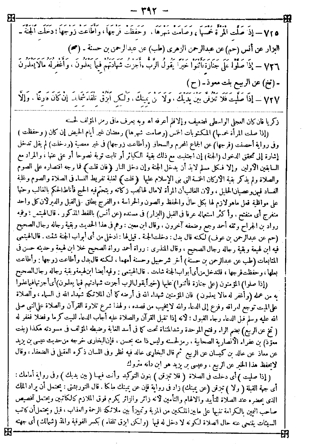 725 - (إذا صلت المرأة خمسها) المكتوبات الخمس (وصامت شهرها) رمضان غير أيام الحيض إن كان (وحفظت) وفي رواية أحصنت (فرجها) عن الجماع المحرم والسحاق (وأطاعت زوجها) في غير معصية (دخلت) لم يقل تدخل إشارة إلى تحقق الدخول (الجنة) إن اجتنبت مع ذلك بقية الكبائر أو تابت توبة نصوحا أو عفي عنها والمراد مع السابقين الأولين وإلا فكل مسلم لا بد أن يدخل الجنة وإن دخل النار (فإن قلت) فما وجه اقتصاره على الصوم والصلاة ولم يذكر بقية الأركان الخمسة التي بني الإسلام عليها (قلت) لغلبة تفريط النساء في الصلاة والصوم وغلبة الفساد فيهن وعصيان الحليل ولأن الغالب أن المرأة لا مال لها تجب زكاته ويتحتم فيه الحج فأناط الحكم بالغالب وحثها على مواظبة فعل ما هو لازم لها بكل حال والحفظ والصون والحراسة والفرج يطلق على القبل والدبر لأن كل واحد منفرج أي منفتح. وأكثر استعماله عرفا في القبل