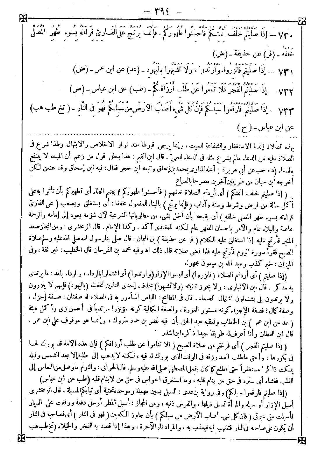 733 - (إذا صليتم فارفعوا سبلكم) وفي رواية بن عدي: السبل بسين مهملة وموحدة تحتية أي ثيابكم المسبلة. قال الزمخشري: أسبل الإزار أو سبله والمرأة تسبل ذيلها والفرس ذنبه ومن المجاز: أسبل المطر أرسل دفعة ووقفت على الديار فأسبلت مني عبرتي (فإن كل شيء أصاب الأرض من سبلكم) بأن جاوز الكعبين (فهو في النار) أي فصاحبه في النار أن يكون على صاحبه في النار فتلتهب فيه فيعذب به والمراد نار الآخرة وهذا إذا قصد به الفخر والخيلاء