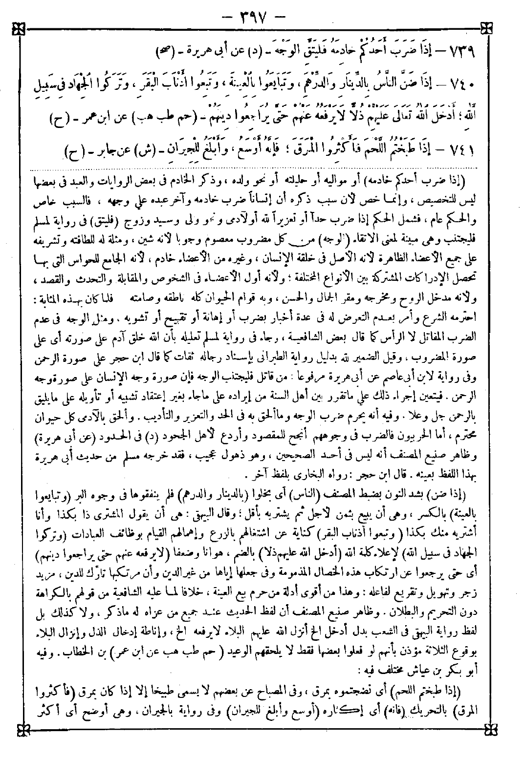 -[397]- 739 - (إذا ضرب أحدكم خادمه) أو مواليه أو حليلته أو نحو ولده وذكر الخادم في بعض الروايات والعبد في بعضها ليس للتخصيص وإنما خص لأن سبب ذكره أن إنسانا ضرب خادمه وآخر عبده على وجهه فالسبب خاص والحكم عام فشمل الحكم إذا ضرب حدا أو تعزيرا لله أو لآدمي ونحو ولي وسيد وزوج (فليتق) في رواية لمسلم فليتجنب وهي مبينة لمعنى الإتقاء (الوجه) من كل مضروب معصوم وجوبا لأنه شين ومثله له للطافته وتشريفه على جميع الأعضاء الظاهرة لأنه الأصل في خلقة الإنسان وغيره من الأعضاء خادم لأنه الجامع للحواس التي بها تحصل الإدراكات المشتركة بين الأنواع المختلفة ولأنه أول الأعضاء في الشخوص والمقابلة والتحدث والقصد ولأنه مدخل الروح ومخرجه ومقر الجمال والحسن وبه قوام الحيوان كله ناطقه وصامته فلما كان بهذه المثابة احترمه الشرع وأمر بعدم التعرض له في عدة أخبار بضرب أو إهانة أو تقبيح أو تشويه ومثل الوجه في عدم الضرب المقاتل لا الرأس كما قال بعض الشافعية وجاء في رواية لمسلم تعليله بأن الله خلق آدم على صورته أي على صورة المضروب وقيل الضمير لله بدليل رواية الطبراني بإسناد رجاله ثقات كما قال ابن حجر على صورة الرحمن وفي رواية لابن أبي عاصم عن أبي هريرة مرفوعا " من قاتل فليتجنب الوجه فإن صورة وجه الإنسان على صورة وجه الرحمن ". فيتعين إجراء ذلك على ما تقرر بين أهل السنة من إيراده على ما جاء بغير إعتقاد تشبيه أو تأويله على ما يليق بالرحمن جل وعلا. وفيه أنه يحرم ضرب الوجه وما ألحق به في الحد والتعزير والتأديب. وألحق بالآدمي كل حيوان محترم أما الحربيون فالضرب في وجوههم أنجح للمقصود وأردع لأهل الجحود