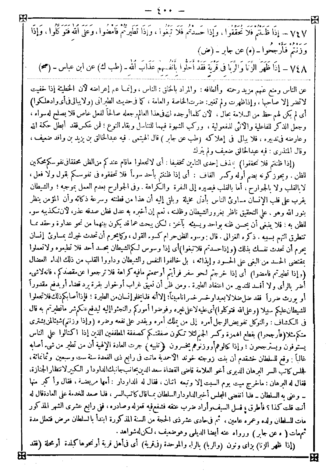 747 - (إذا ظننتم فلا تحققوا) بحذف إحدى التاءين تخفيفا أي لا تجعلوا ما قام عندكم من الظن محققا في نفوسكم محكمين للظن ويجوز كونه بضم أوله وكسر القاف أي إذا ظننتم بأحد سوءا فلا تحققوه في نفوسكم بقول ولا فعل لا بالقلب ولا بالجوارح أما بالقلب فيصيره إلى النفرة والكراهة وفي الجوارح بعدم العمل بموجبه والشيطان يقرب على قلب الإنسان مساوىء الناس بأدنى مخيلة ويلقى إليه أن هذا من فطنته وسرعة ذكائه وأن المؤمن ينظر بنور الله وهو على التحقيق ناظر بغرور الشيطان وظلمته نعم إن أخبره به عدل فظن صدقه عذر لأن تكذيبه سوء للظن به فلا ينبغي أن يحسن ظنه بواحد ويسيئه بآخر لكن يبحث عما قد يكون بينهما من عداوة وحقد مما تتطرق التهم بسببه ذكره الغزالي. قال: وسوء الظن حرام كسوء القول وكما يحرم أن تحدث غيرك بمساوىء إنسان يحرم أن تحدث نفسك بذلك (وإذا حسدتم فلا تبغوا) أي إذا وسوس لكم الشيطان بحسد أحد فلا تطيعوه ولا تعلموا بمقتضى الحسد من البغي على الحسود وإيذائه بل خالفوا النفس والشيطان وداووا القلب من ذلك الداء العضال (وإذا تطيرتم فامضوا) أي إذا خرجتم لنحو سفر فرأيتم أو سمعتم ما فيه كراهة فلا ترجعوا عن مقصدكم فإنه لا شيء أضر بالرأي ولا أفسد للتدبير من اعتقاد الطيرة. ومن ظن أن نعيق غراب أو خوار بقرة يرد قضاء أو يدفع مقدورا أو يورث ضررا فقد ضل ضلالا بعيدا وخسر خسرانا مبينا إلا أنه قلما يخلو إنسان من الطيرة فإذا أصابكم ذلك فلا تجعلوا للشيطان عليكم سبيلا (وعلى الله فتوكلوا) أي عليه لا على غيره وفوضوا أموركم والتجئوا إليه ليدفع عنكم ما تطيرتم به قال في الكشاف: والتوكل تفويض الرجل أمره إلى من يملك أمره ويقدر على نفعه وضره (وإذا وزنتم) شيئا لمن يشتري منكم مثلا (فأرجحوا) بقطع الهمزة وكسر الجيم لئلا تكون صفقتكم كصفقة المطففين الذين إذا اكتالوا على الناس يستوفون ويسترجحون وإذا كالوهم أو وزنوهم يخسرون <تنبيه> جرت العادة الإلهية أن من تطير من شيء أصابه غالبا: وقع للسلطان خشقدم أن بنت زوجته خوند الأحمدية ماتت في رابع ذي القعدة سنة ست وسبعين وثمان مئة فجلس كاتب السر البرهان الديري أخو العلامة قاضي القضاة سعد الدين بجانب جانبك الداودار الكبير لانتظار الجنازة فقال له البرهان: ما خرج ميت يوم السبت إلا وتبعه اثنان فقال له الداودار: أمها مريضة فقال وأكبر منها - وعنى به السلطان - فلما انقضى المجلس أخبر الداودار السلطان بما قال كاتب السر فلما صعد للخدمة على العادة قال له أنت قلت كذا؟ فأطرق فسل السيف وأراد ضرب عنقه فشفع فيه فعزله وصادره ففي رابع عشري الشهر المذكور مات للسلطان ولد وعمره عامين ثم في حادي عشر ذي الحجة من السنة المذكورة ابتدأ بالسلطان مرض فتعلل مدة ثم مات