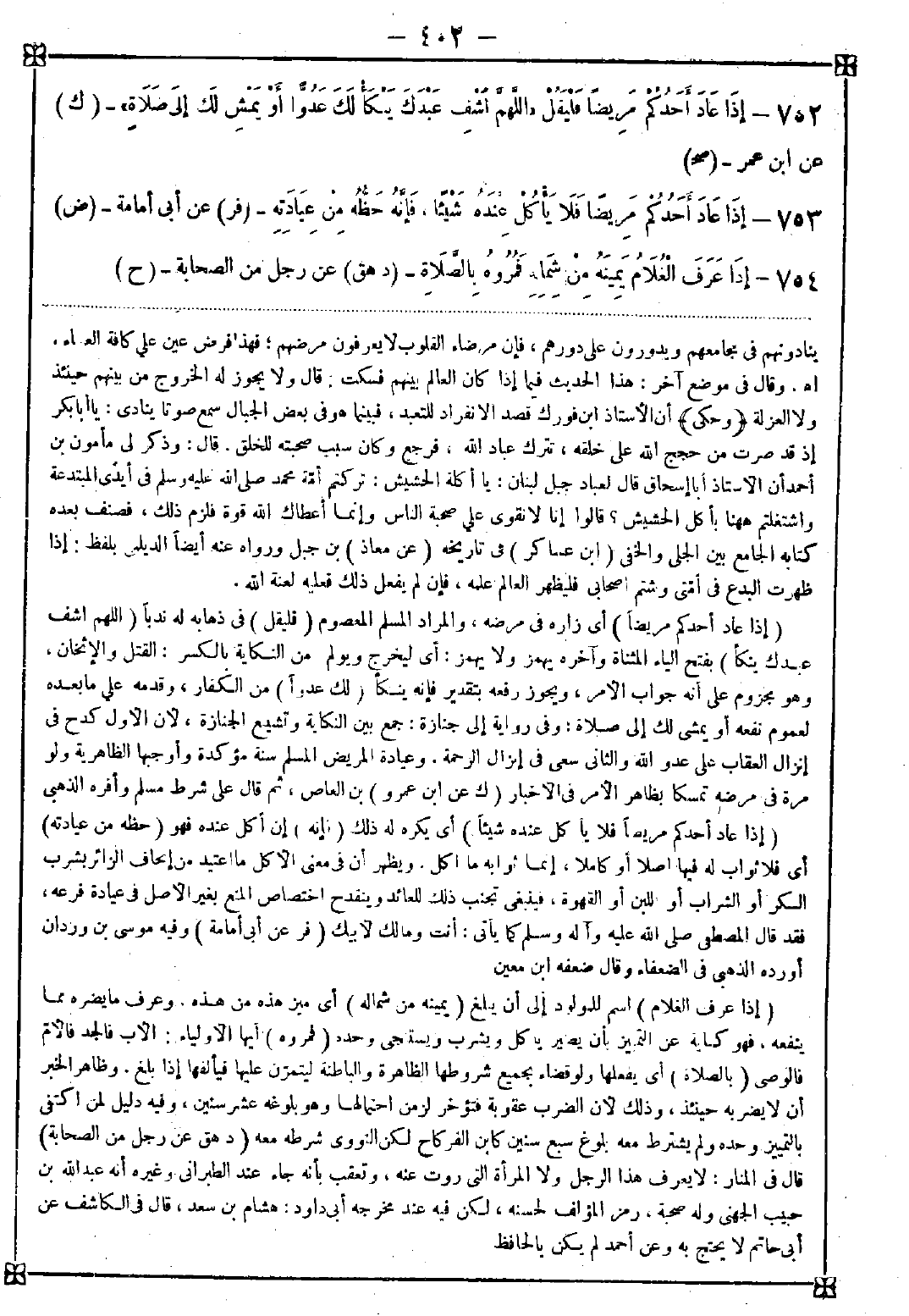 753 - (إذا عاد أحدكم مريضا فلا يأكل عنده شيئا) أي يكره له ذلك (فإنه) إن أكل عنده فهو (حظه من عيادته) (1) أي فلا ثواب له فيها أصلا أو كاملا إنما ثوابه ما أكل. ويطهر أن في معنى الأل ما عتيد من إتحاف الزائر بشرب السكر أو الشراب أو اللبن أو القهوة فينبغي تجنب ذلك للعائد وينقدح اختصاص المنع بغير الأصل في عيادة فرعه فقد قال المصطفى صلى الله عليه وآله وسلم كما يأتي: أنت ومالك لأبيك