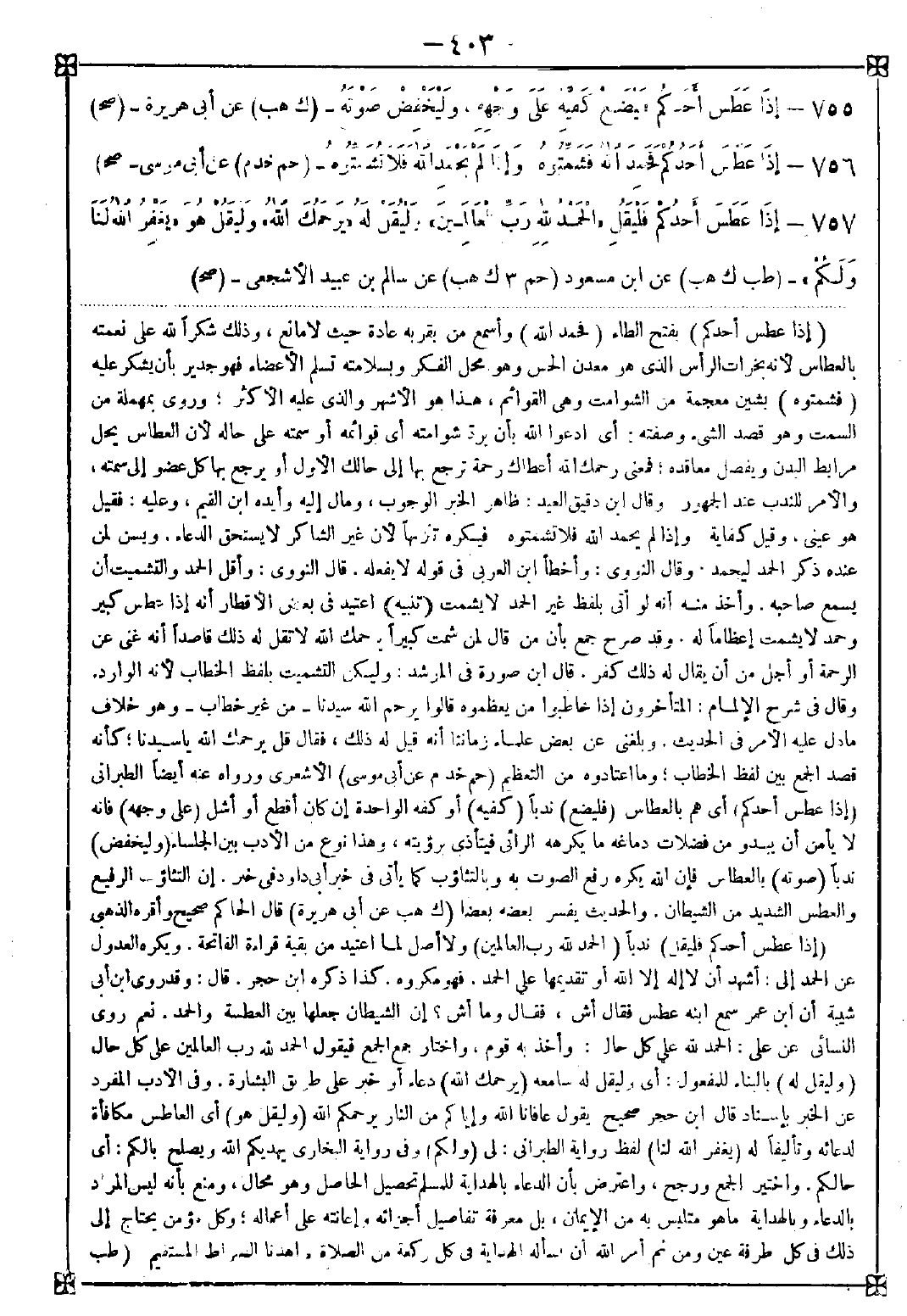 -[403]- 756 - (إذا عطس أحدكم) بفتح الطاء (فحمد الله) وأسمع من بقربه حيث لا مانع وذلك شكرا لله على نعمته بالعطاس لأنه بخرات الرأس الذي هو معدن الحس وهو الفكر وبسلامته تسلم الأعضاء فهو جدير بأن يشكر عليه (فشمتوه) بشين معجمة من الشوامت وهي القوائم هذا هو الأشهر والذي عليه الأكثر وروي بمهملة من السمت وهو قصد الشيء وصفته: أي ادعوا الله بأن يرد شوامته أي قوائمه أو سمته على حاله لأن العطاس يحل مرابط البدن ويفصل معاقده فمعنى رحمك الله أعطاك رحمة ترجع بها إلى حالك الأول أو يرجع بها كل عضو إلى سمته والأمر للندب عند الجمهور وقال ابن دقيق العبد: ظاهر الخبر الوجوب ومال إليه وأيده ابن القيم وعليه فقيل هو عيني وقيل كفاية وإذا لم يحمد فلا تشمتوه فيكره تنزيها لأن غير الشاكر لا يستحق الدعاء. ويسن لمن عنده ذكر الحمد ليحمده