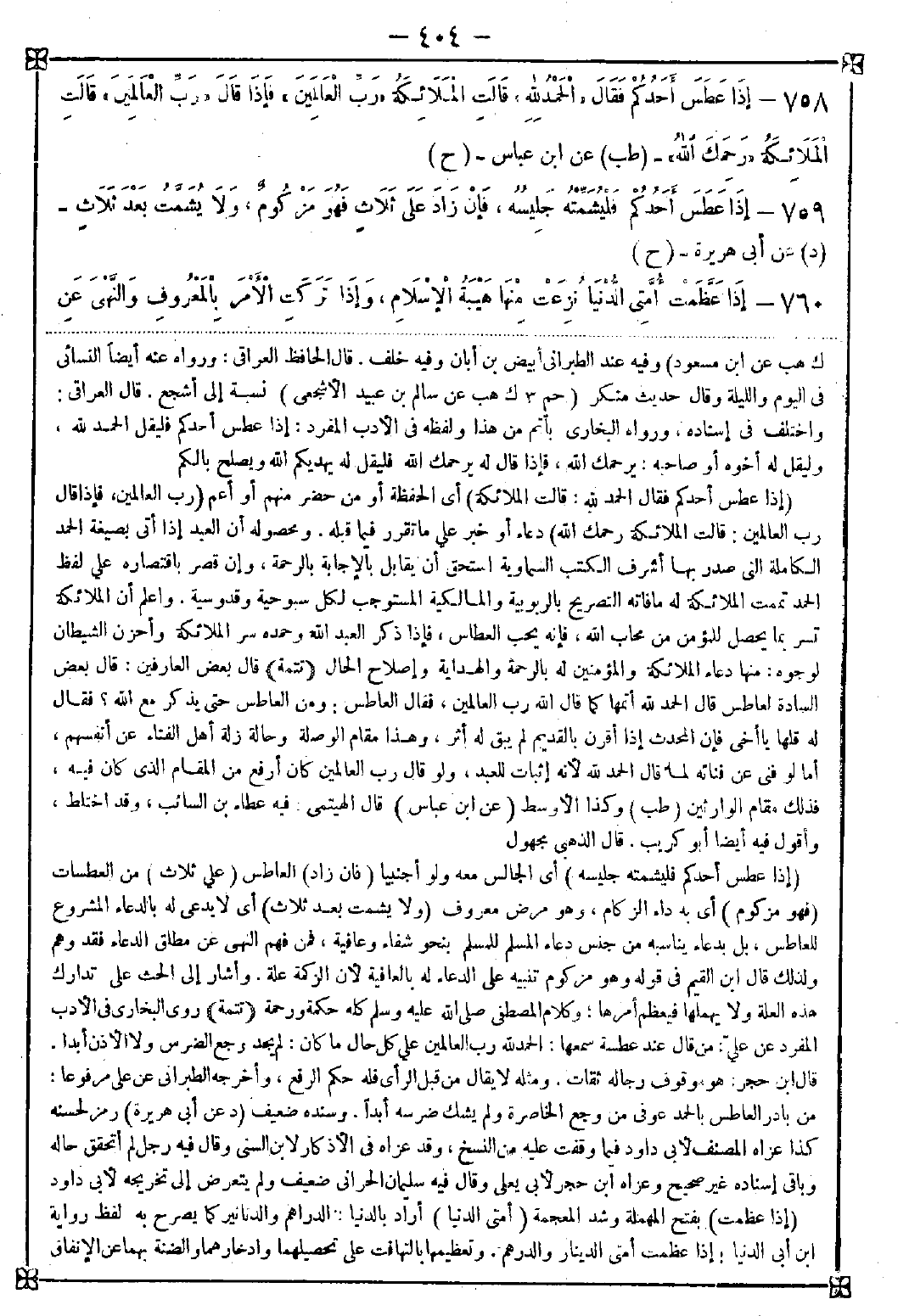 758 - (إذا عطس أحدكم فقال الحمد لله قالت الملائكة) أي الحفظة أو من حضر منهم أو أعم (رب العالمين فإذا قال رب العالمين قالت الملائكة رحمك الله) دعاء أو خبر على ما تقرر فيما قبله. ومحصوله أن العبد إذا أتى بصيغة الحمد الكاملة التي صدر بها أشرف الكتب السماوية استحق أن يقابل بالإجابة وإن قصر باقتصاره على لفظ الحمد تممت الملائكة له ما فاته التصريح بالربوبية والمالكية المستوجب لكل سبوحية وقدوسية. واعلم أن الملائكة تسر بما يحصل للمؤمن من محاب الله فإنه يحب العطاس فإذا ذكر العبد الله وحمده سر الملائكة وأحزن الشيطان لوجوده منها دعاء الملائكة والمؤمنين له بالرحمة والهداية وإصلاح الحال (تتمة) قال بعض العارفين: قال بعض السادة لعاطس قال الحمد لله أتمها كما قال الله رب العالمين فقال العاطس: ومن العاطس حتى يذكر مع الله؟ فقال له قلها ياأخي فإن المحدث إذا أقرن بالقديم لم يبق له أثر وهذا مقام الوصلة وحالة زلة أهل الفناء عن أنفسهم أما لو فنى عن فنائه لما قال الحمد لله لأنه إثبات للعبد ولو قال رب العالمين كان أرفع من المقام الذي كان فيه فذلك مقام الوارثين