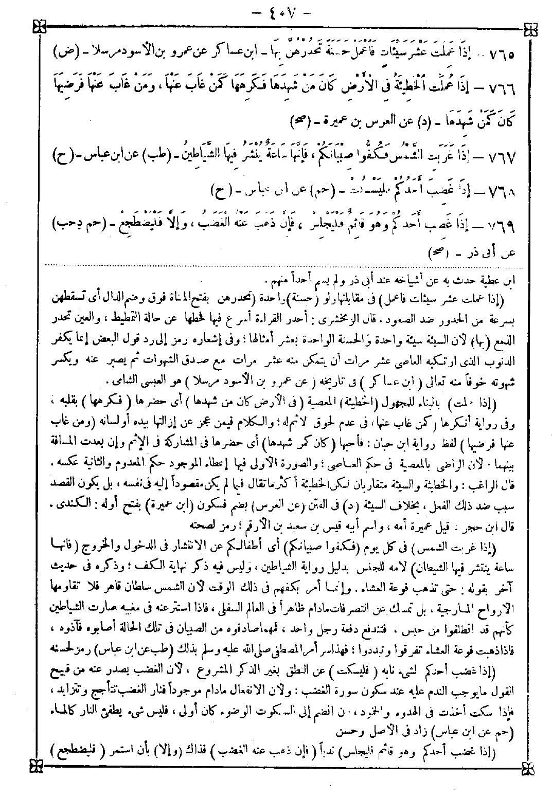 769 - (إذا غضب أحدكم وهو قائم فليجلس) ندبا (فإن ذهب عنه الغضب) فذاك (وإلا) بأن استمر (فليضطجع) -[408]- على جنبه لأن القائم متهيء للانتقام والجالس دونه والمضطجع دونهما. والقصد أن يبتعد عن هيئة الوثوب والمبادرة للبطش ما أمكن حسما لمادة المبادرة. وحمل الطيبي (قوله وحمل: بفتح الحاء وسكون الميم مبتدأ) الاضطجاع هنا على التواضع والخفض لأن الغضب منشؤه الكبر والترفع: صرف (قوله صرف: خبر المبتدأ الماء وهو حمل اه.) للفظ عن ظاهره بلا ضرورة. قال اابن العربي: والغضب يهيج الأعضاء اللسان أولا ودواؤه السكوت. والجوارح بالإستطالة ثانيا ودواؤه الاضطجاع. وهذا إذا لم يكن الغضب لله وإلا فهو من الدين وقوة النفس في الحق: فبالغضب قوتل الكفار وأقيمت الحدود وذهبت الرحمة عن أعداء الله من القلوب وذلك يوجب أن يكون القلب عاقدا والبدن عاملا بمقتضى الشرع. وفي الحديث وما قبله أن الغضبان مكلف. لأنه كلفه بما يسكنه من القول والفعل وهذا عين تكليفه بقطع الغضب. وما نقل عن الفضيل وغيره أن من كان سبب غضبه مباحا كالسفر أو طاعة كالصوم فغير مكلف بما يصدر عنه: فمؤول