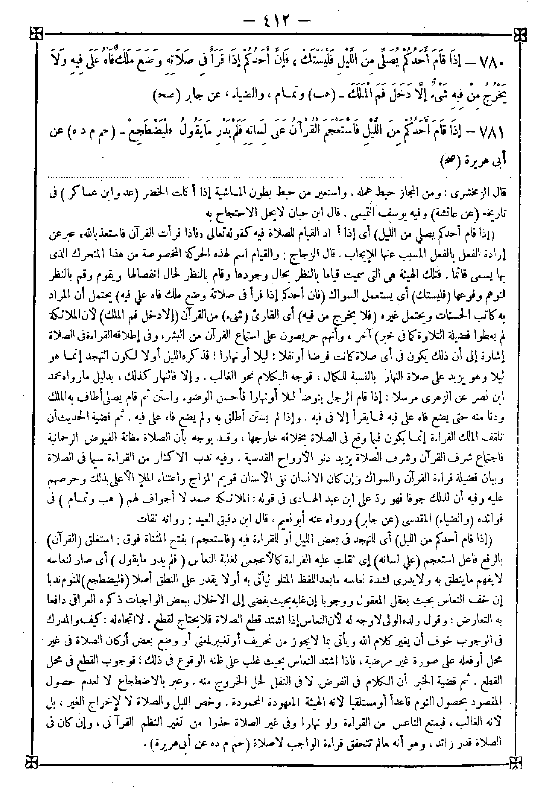 781 - (إذا قام أحدكم من الليل) أي للتهجد في بعض الليل أو للقراءة فيه (فاستعجم) بفتح المثناة فوق: استغلق (القرآن) بالرفع فاعل استعجم (على لسانه) إي ثقلت عليه القراءة كالأعجمي لغلبة النعاس (فلم يدر ما يقول) أي صار لنعاسه لا يفهم ما ينطق به ولا يدري لشدة نعاسه ما بعد اللفظ المتلو ليأتي به أو لا يقدر على النطق أصلا (فليضطجع) للنوم ندبا إن خف النعاس بحيث يعقل المعقول ووجوبا إن غلبه بحيث يفضي إلى الإخلال ببعض الواجبات ذكره العراقي دافعا به التعارض: وقول ولده الولي لا وجه له لأن النعاس إذا اشتد قطع الصلاة فلا يحتاج لقطع. لا اتجاه له: كيف والمدرك في الوجوب خوف أن يغير كلام الله ويأتي بما لا يجوز من تحريف أو تغيير لمعنى أو وضع بعض أركان الصلاة في غير محل أو فعله على صورة غير مرضية فإذا اشتد النعاس بحيث غلب على ظنه الوقوع في ذلك فوجوب القطع في محل القطع. ثم قضية الخبر أن الكلام في الفرض لا في النفل لحل الخروج منه. وعبر بالاضطجاع لا لعدم حصول المقصود بحصول النوم قاعدا أو مستلقيا لأنه الهيئة المعهودة المحمودة. وخص الليل والصلاة لا لإخراج الغير بل لأنه الغالب فيمنع الناعس من القراءة ولو نهارا وفي غير الصلاة حذرا من تغير النظم القرآني وإن كان في الصلاة قدر زائد وهو أنه ما لم تتحقق قراءة الواجب لا صلاة
