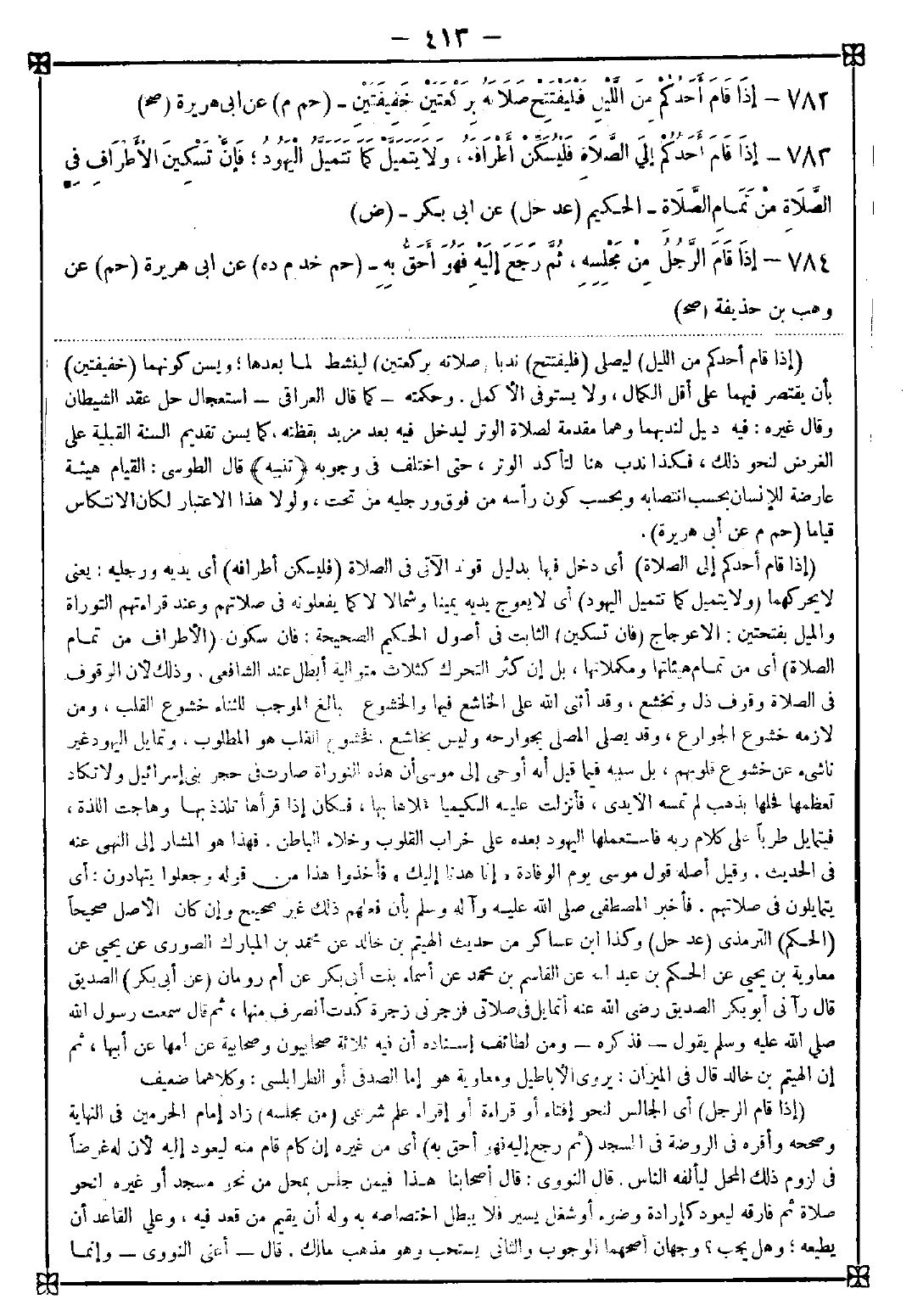 783 - (إذا قام أحدكم إلى الصلاة) أي دخل فيها بدليل قوله الآتي في الصلاة (فليسكن أطرافه) أي يديه ورجليه يعني لا يحركهما (ولا يتميل كما تتميل اليهود) أي لا يعوج يديه يمينا وشمالا لا كما يفعلونه في صلاتهم وعند قراءتهم التوراة والميل بفتحتين: الاعوجاج (فإن تسكين) الثابت في أصول الحكيم الصحيحة فإن سكون (الأطراف من تمام الصلاة) أي من تمام هيئاتها ومكملانها بل إن كثر التحرك كثلاث متوالية أبطل عند الشافعي. وذلك لأن الوقوف في الصلاة وقوف ذل وتخشع وقد أثنى الله على الخاشع فيها والخشوع البالغ الموجب للثناء خشوع القلب ومن لازمه خشوع الجوارح وقد يصلي المصلي بجوارحه وليس بخاشع فخشوع القلب هو المطلوب. وتمايل اليهود غير ناشئ عن خشوع قلوبهم بل سببه فيما قيل أنه أوحي إلى موسى أن هذه التوراة صارت في حجر بني إسرائيل ولا تكاد تعظمها فحلها بذهب لم تمسه الأيدي فأنزلت عليه الكيميا فحلاها بها فكان إذا قرأها تلذذ بها وهاجت اللذة فيتمايل طربا على كلام ربه فاستعملها اليهود بعده على خراب القلوب وخلاء الباطن. فهذا هو المشار إلى النهي عنه في الحديث. وقيل أصله قول موسى يوم الوفادة {إنا هدنا إليك} فأخذوا هذا من قوله وجعلوا يتهادون: أي يتمايلون في صلاتهم فأخبر المصطفى صلى الله عليه وآله وسلم بأن فعلهم ذلك غير صحيح وإن كان الأصل صحيحا