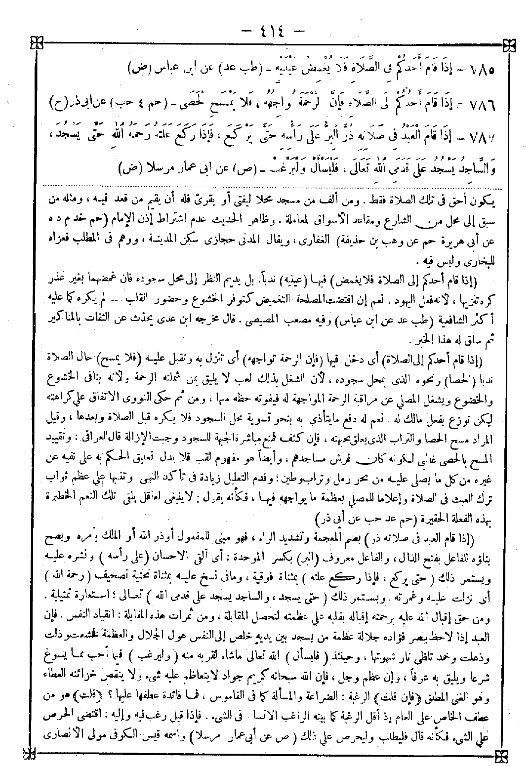786 - (إذا قام أحدكم إلى الصلاة) أي دخل فيها (فإن الرحمة تواجهه) أي تنزل به وتقبل عليه (فلا يمسح) حال الصلاة ندبا (الحصا) ونحوه الذي بمحل سجوده لأن الشغل بذلك لعب لا يليق بمن شملته الرحمة ولأنه ينافي الخشوع والخضوع ويشغل المصلي عن مراقبة الرحمة المواجهة له فيفوته حظه منها ومن ثم حكى النووي الاتفاق على كراهته لكن نوزع بفعل مالك له. نعم له دفع ما يتأذى به بنحو تسوية محل السجود فلا يكره قبل الصلاة وبعدها وقيل المراد مسح الحصا والتراب الذي يعلق بجبهته فإن كثف فمنع مباشرة الجبهة للسجود وجبت الإزالة قال العراقي: وتقييد المسح بالحصى غالبي لكونه كان فرش مساجدهم وأيضا هو مفهوم لقب فلا يدل تعليق الحكم به على نفيه عن غيره من كل ما يصلي عليه من نحو رمل وتراب وطين وقدم التعليل زيادة في تأكد النهي وتنبيها على عظم ثواب ترك العبث في الصلاة وإعلاما للمصلي بعظمة ما يواجهه فيها فكأنه يقول: لا ينبغي لعاقل يلقي تلك النعم الخطيرة بهذه الفعلة الحقيرة