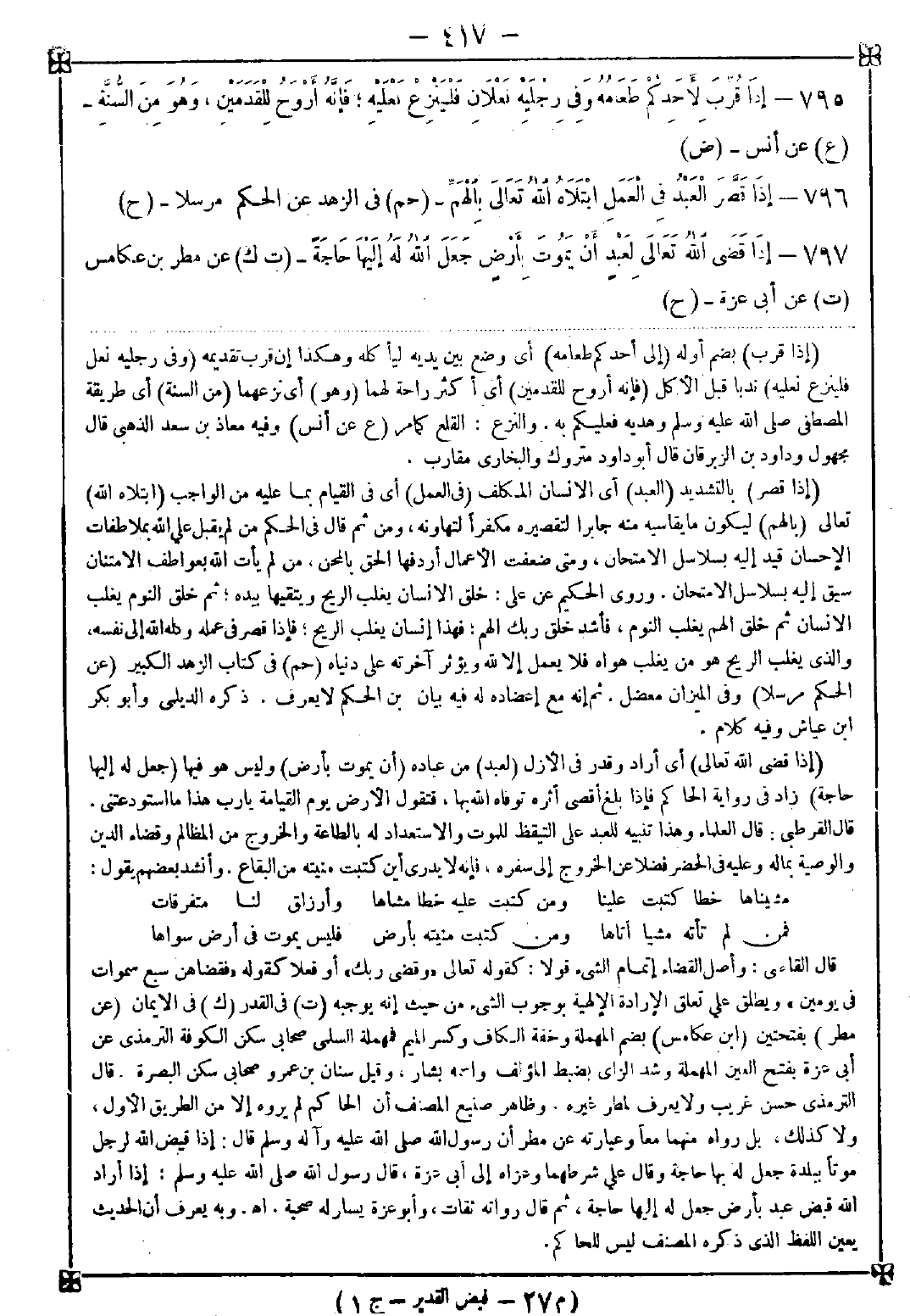 797 - (إذا قضى الله تعالى) أي أراد وقدر في الأزل (لعبد) من عباده (أن يموت بأرض) وليس هو فيها (جعل له إليها حاجة) زاد في رواية الحاكم فإذا بلغ أقصى أثره توفاه الله بها فتقول الأرض يوم القيامة يا رب هذا ما استودعتني. قال القرطبي: قال العلماء وهذا تنبيه للعبد على التيقظ للموت والاستعداد له بالطاعة والخروج من المظالم وقضاء الدين والوصية بماله وعليه في الحضر فضلا عن الخروج إلى سفره فإنه لا يدري أين كتبت منيته من البقاع. وأنشد بعضهم يقول: