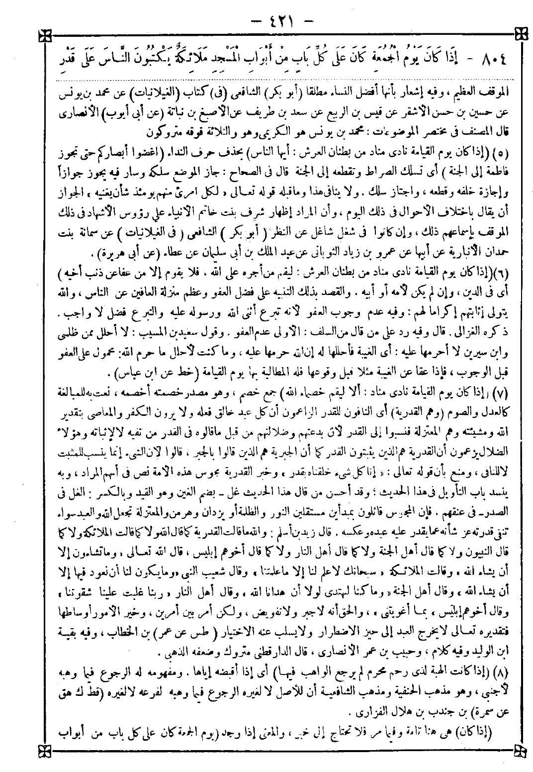 804 - (إذا كان) هي هنا تامة وفيما مر فلا تحتاج إلى خبر والمعنى إذا وجد (يوم الجمعة كان على كل باب من أبواب -[422]- المسجد) لامه للجنس أو للاستغراق. فالمراد جميع المساجد وخصها لأن الغالب إقامة الجمعة في مسجد (ملائكة) بالتنكير للتكثير لمناسبة المصلين أي جمع كثير من الملائكة وهم هنا غير الحفظة كما يفيده قوله الآتي طووا الصحف فوظيفة هؤلاء كتابة من يحضر الجمعة أولا فأولا واستماع الذكر (يكتبون الناس) أي أجور المجتمعين (على قدر منازلهم) أي مراتبهم في المجيء. ولهذا قال (الأول) أي ثواب من يأتي في الوقت الأول (فالأول) أي يكتبون ثواب من يجيء بعده في الوقت الثاني سماه أولا لأنه سابق على من يجيء في الوقت الثالث فالأول هنا بمعنى الأسبق وقال في شرح المصابيح: الأول فالأول نصب على الحال وجاءت معرفة وهو قليل وقال الزركشي: الأول فالأول نصب على الحال: أي مرتبين وجاز مجيئهما معرفة على الشذوذ فإذا جلس الإمام أي صعد المنبر وجلس عليه للخطبة (طووا) أي الملائكة (الصحف) صحف الفضائل المتعلقة بالمبادرة إلى الجمعة لا غيرها من أعمالها فإنه إنما يكتبها الحافظان وهي جمع صحيفة الورقة التي يكتب فيها وفي استماع الملائكة الخطبة حث على استماعها لنا وهو سنة وإن كان سماعها واجبا (وجاؤوا يستمعون الذكر) أي الخطبة فلا يكتبون ثواب من يجيء في ذلك الوقت (ومثل المهجر) أي وصلاة الآتي في أول ساعة وهو اسم فاعل من هجر يهجر: إذا بكر وأتى الأمر من أوله أو من هجر منزله إذا تركه أي وقت كان وكيفما كان ليس من الهاجرة التي هي شدة الحر كما زعمه المالكية (كمثل) بزيادة الكاف أو مثل (الذي يهدي) بضم أوله: أي يقرب (بدنه) أي يتصدق ببعير ذكرا أو أنثى متقربا إلى الله: فالهاء للوحدة لا للتأنيث قال في الكشاف: سميت به لعظم بدنها وهي للإبل خاصة وقال غيره للتبدن وللبدانة: السمن وفي رواية ابن جريج عن عبد الرزاق فله من الأجر مثل الحزور وظاهره أن الثواب لو تجسد كان قدره (ثم كالذي يهدي بقرة) ذكرا أو أنثى فالهاء للوحدة سميت به لأنها تبقر الأرض: أي تشقها وهذا خبر مبتدأ محذوف تقديره ثم الثاني أي الآتي في الساعة الثانية كالذي يهدي بقرة وليس معطوفا على الخبر الأول لئلا يقعا معا مع عدم اجتماعهما خبرا عن واحد وهو ممتنع وكذا يقدر في الثلاثة الآتية وانحطاط رتبة البقرة هنا عن البدنة موافق لما في الأضحية من حيث الأفضلية المناسبة لما هنا ومخالف له من حيث إجزاء كل منهما عن سبعة ثم وفرق بأن المععتبر هنا كبر الجسم في البدنة مع كونها أحب أموال العرب وأنفسها عندهم وثم كثرة اللحم وأطيبته وهو في البدنة أكثر وفي البقرة أطيب فيعتدلان فسوى بينهما (ثم كالذي يهدي الكبش) فحل الضأن في أي سن كان أو إذا أربع أو إذا أثنى ووصفه في رواية بكونه أقرن لكماله وحسن صورته ولأن قرنه ينتفع به وفي صحيح ابن خزيمة شاة بدل كبش وهي محمولة عليه (ثم كالذي يهدي الدجاجة) بتثليث الدال والفتح أفصح وفي صحيح ابن خزيمة طائر بدل دجاجة وهي محمول عليها واستشكل التعبير بالهدي في دجاجة وبيضة بأنه لا يكون منهما وأوجيب بأنه من باب المشاكلة أي من تسمية الشيء باسم قرينه والمراد بالهدي هنا التصدق (ثم كالذي يهدي البيضة) بيضة دجاجة كما هو المتبادر وفي النسائي بعد الكبش بطة ثم دجاجة ثم بيضة وفي رواية بعد الكبش دجاجة ثم عصفورا ثم بيضة وإسنادهما صحيح وبذلك يتضح استيعاب الست ساعات التي هي نصف النهار وليس المراد بها الفلكية كما في الروضة تبعا للنص لئلا يستوي الإتيان في طرفي ساعة بل أوقات تترتب فيها درجات السابقين على من يليهم في الفضيلة لكن في المجموع وشرح مسلم المراد الفلكية لكن بدنة الأول أكمل من بدنة الأخير وبدنة المتوسط متوسطة وفي إعتناء الملائكة بكتابه السابق دلالة على ندب التبكير إليها وهو ما عليه الأئمة الثلاثة وذهب مالك وبعض الشافعية كإمام الحرمين إلى أفضلية -[423]- تأخير الذهاب إلى الزوال وأشعر قوله فإذا خرج الإمام طويت الصحف أنه مستثنى من ندب التبكير لدلالته على أنه لا يخرج إلا بعد انقضاء وقت التبكير فيسن له التأخير إ