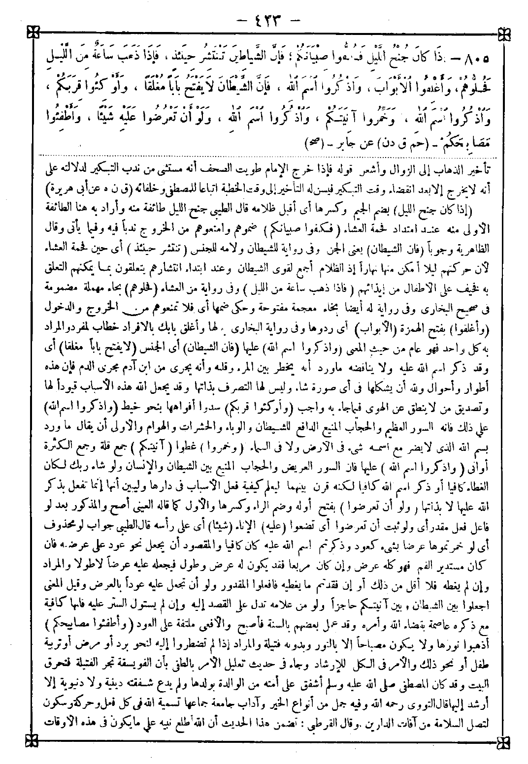 805 - (إذا كان جنح الليل) بضم الجيم وكسرها أي أقبل ظلامه قال الطيبي جنح الليل طائفة منه وأراد به هنا الطائفة الأولى منه عند امتداد فحمة العشاء (فكفوا صبيانكم) ضموهم وامنعوهم من الخروج ندبا فيه وفيما يأتي وقال الظاهرية وجوبا (فإن الشيطان) يعني الجن وفي رواية للشيطان ولامه للجنس (تنتشر حينئذ) أي حين فحمة العشاء لأن حركتهم ليلا أمكن منها نهارا إذ الظلام أجمع لقوى الشيطان وعند ابتداء انتشارهم يتعلقون بما يمكنهم التعلق به فخيف على الأطفال من إيذائهم (فإذا ذهب ساعة من الليل) وفي رواية من العشاء (فحلوهم) بحاء مهملة مضمومة في صحيح البخاري وفي رواية له أيضا بخاء معجمة مفتوحة وحكي ضمها أي فلا تمنعوهم من الخروج والدخول (وأغلقوا) بفتح الهمزة (الأبواب) أي ردوها وفي رواية البخاري لها وأغلق بابك بالإفراد خطاب لمفرد والمراد به كل واحد فهو عام من حيث المعنى (واذكروا اسم الله) عليها (فإن الشيطان) أي الجنس (لا يفتح بابا مغلقا) أي وقد ذكر اسم الله عليه ولا يناقضه ما ورد أنه يخطر بين المرء وقلبه وأنه يجري من ابن آدم مجرى الدم فإن هذه أطوار وأحوال ولله أن يشكلها في أي صورة شاء وليس لها التصرف بذاتها وقد يجعل الله هذه الأسباب قيودا لها وتصديق من لا ينطق عن الهوى فيما جاء به واجب (وأوكثوا قربكم) سدوا أفواهها بنحو خيط (واذكروا اسم الله) على ذلك فإنه السور العظيم والحجاب المنيع الدافع للشيطان والوباء والحشرات والهوام والأولى أن يقال ما ورد بسم الله الذي لا يضر مع اسمه شيء في الأرض ولا في السماء (وخمروا) غطوا (آنينكم) جمع قلة وجمع الكثرة أواني (واذكروا اسم الله) عليها فإن السور العريض والحجاب المنيع بين الشيطان والإنسان ولو شاء ربك لكان الغطاء كافيا أو ذكر اسم الله كافيا لكنه قرن بينهما ليعلم كيفية فعل الأسباب في دارها وليبين أنها إنما تفعل بذكر الله عليها لا بذاتها (ولو أن تعرضوا) بفتح أوله وضم الراء وكسرها والأول كما قاله العيني أصح والمذكور بعد لو فاعل فعل مقدر أي ولو ثبت أن تعرضوا أي تضعوا (عليه) الإناء (شيئا) أي على رأسه قال الطيبي: جواب لو محذوف أي لو خمرتموها عرضا بشيء كعود وذكرتم اسم الله عليه كان كافيا والمقصود أن يجعل نحو عود على عرضه فإن كان مستدير الفم فهو كله عرض وإن كان مربعا فقد يكون له عرض وطول فيجعله عليه عرضا لا طولا والمراد وإن لم يغطه فلا أقل من ذلك أو إن فقدتم ما يغطيه فافعلوا المقدور ولو أن تجعل عليه عودا بالعرض وقيل المعنى اجعلوا بين الشيطان وبين آنيتكم حاجزا ولو من علامة تدل على القصد إليه وإن لم يستول الستر عليه فإنها كافية مع ذكره عاصمة بفضاء الله وأمره وقد عمل بعضهم بالسنة فأصبح والأفعى ملتفة على العود (وأطفئوا مصابيحكم) اذهبوا نورها ولا يكون مصباحا إلا بالنور وبدونه فتيلة والمراد إذا لم تضطروا إليه لنحو برد أو مرض أو تربية طفل أو نحو ذلك والأمر في الكل للإرشاد وجاء في حديث تعليل الأمر بالطفي بأن الفويسقة تجر الفتيلة فتحرق البيت وقد كان المصطفى صلى الله عليه وسلم أشفق على أمته من الوالدة بولدها ولم يدع شفقته دينية ولا دنيوية إلا أرشد إليها قال النووي رحمه الله وفيه جمل من أنواع الخير وآداب جامعة جماعها تسمية الله في كل فعل وحركة وسكون لتصل السلامة من آفات الدارين. وقال القرطبي: تضمن هذا الحديث أن الله أطلع نبيه على ما يكون في هذه الأوقات -[424]- من المضار من جهة الشياطين والفأر والوباء وقد أرشد إلى ما يتقي به ذلك فليبادر إلى فعل تلك الأمور ذاكرا لله ممتثلا أمر نبيه صلى الله عليه وسلم شاكرا لنصحه فمن فعل لم يصبه من ذلك ضرر بحول الله وقوته. وفيه رد علي من كره غلق الباب من الصوفية وقال الصوفية يفتحون ولا يغلقون