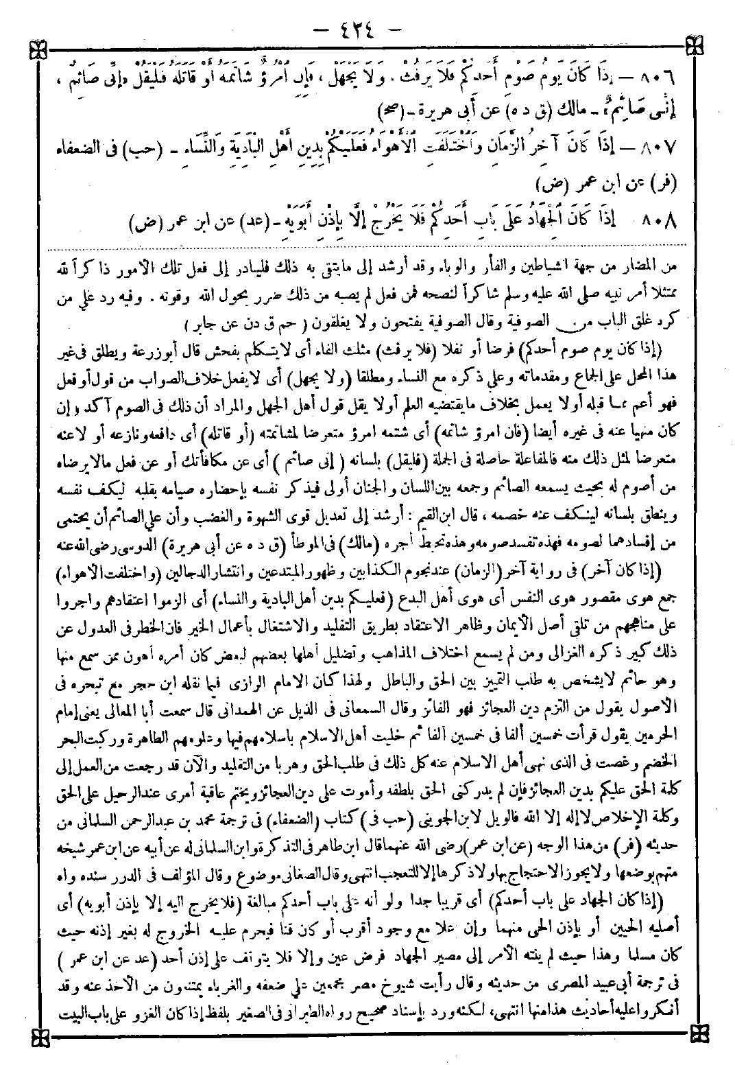 808 - (إذا كان الجهاد على باب أحدكم) أي قريبا جدا ولو أنه على باب أحدكم مبالغة (فلا يخرج اليه إلا بإذن أبويه) أي أصليه الحيين أو بإذن الحي منهما وإن علا مع وجود أقرب أو كان قنا فيحرم عليه الخروج له بغير إذنه حيث كان مسلما وهذا حيث لم ينته الأمر إلى مصير الجهاد فرض عين وإلا فلا يتوقف على إذن أحد