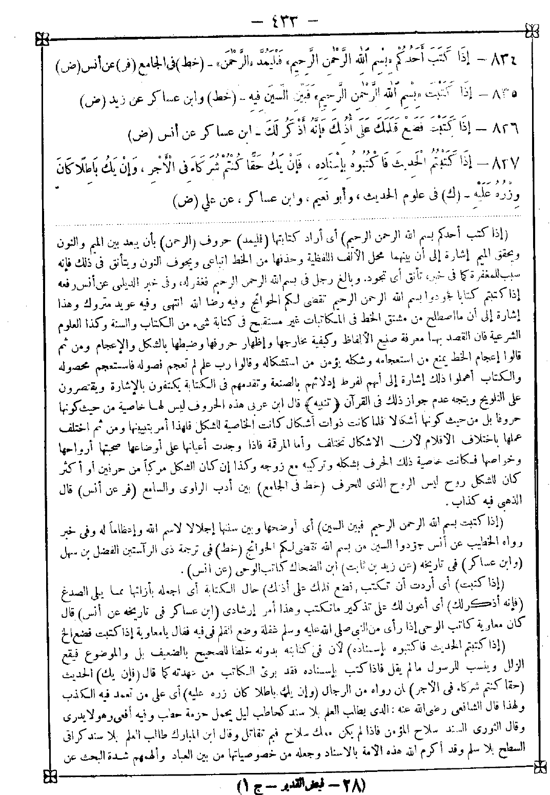 -[433]- 834 - (إذا كتب أحدكم بسم الله الرحمن الرحيم) أي أراد كتابتها (فليمد) حروف (الرحمن) بأن يبعد بين الميم والنون ويحقق الميم إشارة إلى أن بينهما محل الألف اللفظية وحذفها من الخط اتباعي ويجوف النون ويتأنق في ذلك فإنه سبب للمغفرة كما في خبر تأنق أي تجود. وبالغ رجل في بسم الله الرحمن الرحيم فغفر له وفي خبر الديلمي عن أنس رفعه إذا كتبتم كتابا فجودوا بسم الله الرحمن الرحيم تقضى لكم الحوائج وفيه رضا الله انتهى وفيه عويد متروك وهذا إشارة إلى أن ما اصطلح من مشتق الخط في المكاتبات غير مستقبح في كتابة شيء من الكتاب والسنة وكذا العلوم الشرعية فإن القصد بها معرفة صنيع الألفاظ وكيفية مخارجها وإظهار حروفها وضبطها بالشكل والإعجام ومن ثم قالوا إعجام الخط يمنع من استعجامه وكله يؤمن من استشكاله وقالوا رب علم تعجم فصوله فاستعجم محصوله والكتاب أهملوا ذلك إشارة إلى أنهم لفرط إدلائهم بالصنعة وتقديمهم في الكتابة يكتفون بالإشارة ويقتصرون على التلويح ويتجه عدم جواز ذلك في القرآن. <تنبيه> قال ابن عربي هذه الحروف ليس لها خاصية من حيث كونها حروفا بل من حيث كونها أشكالا فلما كانت ذوات أشكال كانت الخاصية للشكل فلهذا أمر بتبينيها ومن ثم اختلف عملها باختلاف الأقلام لأن الأشكال تختلف وأما المرقمة فإذا وجدت أعيانها على أوضاعها صحبتها أرواحها وخواصها فكانت خاصية ذلك الحرف بشكله وتركيبه مع زوجه وكذا إن كان الشكل مركبا من حرفين أو أكثر كان للشكل روح ليس الروح الذي للحرف