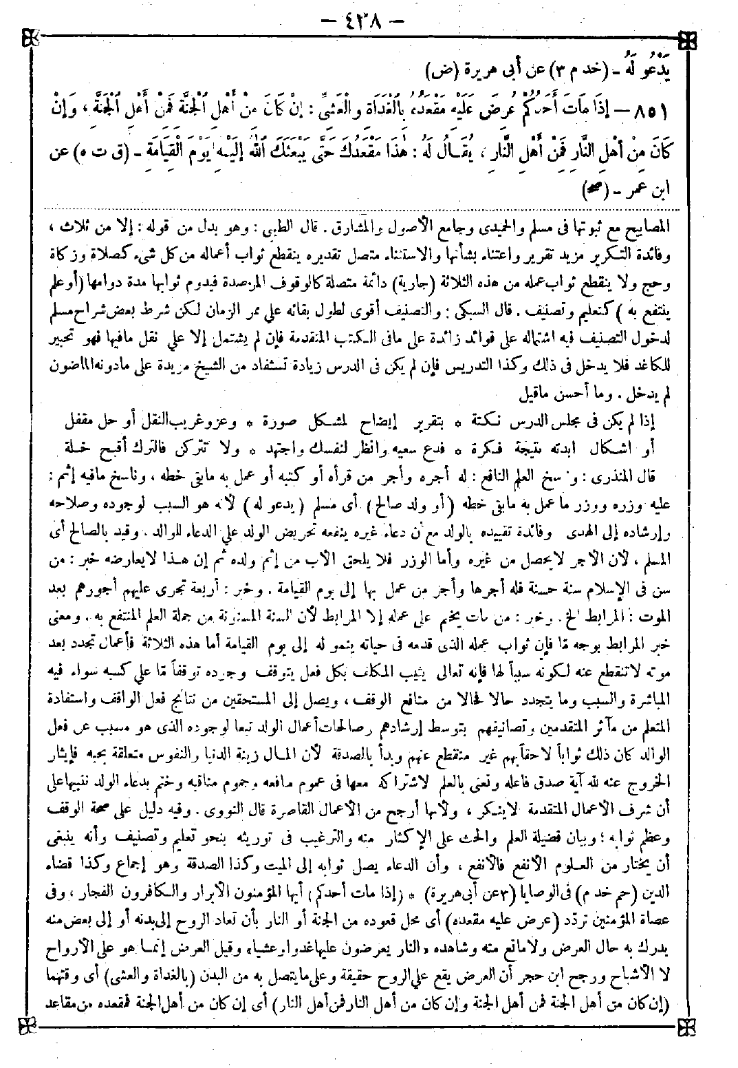 851 - (إذا مات أحدكم) أيها المؤمنون الأبرار والكافرون الفجار وفي عصاة المؤمنين تردد (عرض عليه مقعده) أي محل قعوده من الجنة أو النار بأن تعاد الروح إلى بدنه أو إلى بعض منه يدرك به حال العرض ولا مانع منه وشاهده {النار يعرضون عليها غدوا وعشيا} وقيل العرض إنما هو على الأرواح لا الأشباح ورجح ابن حجر أن العرض يقع على الروح حقيقة وعلى ما يتصل به من البدن (بالغداوة والعشي) أي وقتهما (إن كان من أهل الجنة فمن أهل الجنة وإن كان من أهل النار فمن أهل النار) أي إن كان من أهل الجنة فمقعده من مقاعد -[439]- أهل الجنة يعرض عليه وإن كان من أهل النار فمقعده من مقاعد أهل النار يعرض عليه فليس الجزاء والشرط متحدين معنى بل لفظا ولا ضير فيه بل يدل على الفخامة (ثم يقال له من قبل الله) أي يأمر الله الملك أو من شاء من خلقه يقول له ذلك (هذا مقعدك حتى يبعثك الله إليه) أي إلى ذلك المقعد (يوم القيامة) أي لا تصل إليه إلا بعد البعث ويحتمل رجوع الضمير إلى الله. كذا قرره التوربشتي وقال الطيبي: يجوز كون معناه فمن كان من أهل الجنة فيبشر بما لا يكنه كنهه ولا يقدر قدره وإن كان من أهل النار فبالعكس لأن هذا القول طليعة تباشير السعادة الكبرى. ومقدمة بتاريخ الشقاوة لأن الشرط والجزاء إذا اتحدا دل الجزاء على الفخامة قال: والضمير في إليه يرجع إلى المقعد فالمعنى هذا مقعد يستقر فيه حتى يبعث إلى مثله من الجنة أو النار كقوله تعالى {هذا الذي رزقنا من قبل} أي مثل الذي أويرجع إلى الله أو إلى لقاء الله أو إلى المحشر أي هذا الآن مقعده إلى يوم المحشر فترى عند ذلك كرامة أو هوانا تنشىء عنده هذا المقعد وفيه إثبات عذاب القبر لأن عرض مقعده من النار عليه نوع عظيم من العذاب