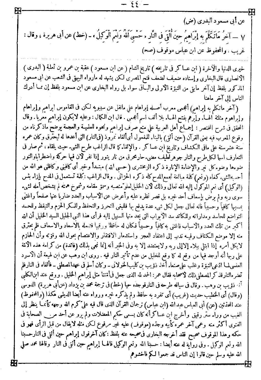 7 - (آخر ما تكلم به إبراهيم) أعجمي معرب أصله إبراهام على ما نقل عن سيبويه لكن في القاموس إبراهيم وإبراهام وإبراهوم مثله الهاء وإبرهم بفتح الهاء بلا ألف اسم أعجمي. قال ابن الكمال: وعليه لا يكون إبراهيم معربا. وقال المحقق في شرح المختصر: إجماع أهل العربية على منع صرف إبراهيم ونحوه للعلمية والعجمة يوضح ما ذكرناه من وقوع المعرب فيه يعني القرآن (حين ألقي) بالبناء للمفعول أي ألقاه نمروذ (في النار) التي أعدها له ليحترق وكان عمره ستة عشر سنة على ما في الكشاف وتاريخ ابن عساكر. والإلقاء كما قال الراغب طرح الشيء حيث يلقاه ثم صار في التعارف اسما لكل طرح والنار جوهر لطيف مضيء حار محرق من نار ينور إذا نفر لأن فيها حركة واضطرابا والنور ضوءها وضوء كل نير والإضاءة الإنارة ذكره الزمخشري (حسبي الله) مبتدأ وخبر أي كافيني وكافلني هو الله من أحسبه الشيء كفاه (ونعم) كلمة مبالغة تجمع المدح كله ذكره الحراني. وقال الراغب: كلمة تستعمل في المدح بإزاء بئس (الوكيل) أي نعم الموكول إليه الله تعالى وذلك لأن الخليل لعلو منصبه وسمو مقامه وشموخ همته لم يشخص أمله لشيء سوى ربه ولم يرض بإسعاف أحد غيره بل قصر نظره عليه وأعرض عن الأسباب والعدد ضاربا عنها صفحا واغتنى بمسببها كافيا وحسيبا فإنه تعالى جعل لكل شيء عدة يدفع بها فللبغي التحرز والتحفظ وللمكر الحزم والتيقظ وللحسد التواضع للحاسد ومداراته وللكائد سد الأبواب التي يجد منها السبيل إليه فرأى هذا النبي الجليل السيد الخليل أن الله أكبر من تلك العدد والأسباب فاغتنى به كافيا وحسيبا فكان له حافظا ورقيبا فشمله بالإسعاد والإسعاف فلم يحترق منه إلا موضع الكتاف وفيه ندب إلى اعتقاد العجز واستشعار الافتقار والاعتصام بحول الله وقوته وأن الحازم لا يكل أمره إذا ابتلي ببلاء إلا إلى ربه ولا يعتضد إلا به وفي الخبر أنه إنما نجي بذلك <فائدة> من كرامة هذه الأمة على ربها أنه أوجد فيها من وقع له كما وقع للخليل من عدم تأثير النار فيه. روى ابن وهب عن ابن لهيعة أن الأسود العنسي لما ادعى النبوة وغلب على صنعاء أخذ ذؤيب بن كليب الخولاني - وكان أسلم في عهد المصطفى - فألقاه في النار فلم تضره النار فذكر المصطفى ذلك لأصحابه فقال عمر: الحمد لله الذي جعل في أمتنا مثل إبراهيم الخليل. ووقع عند ابن الكلبي أنه ذؤيب بن وهب. وقال في سياقه طرحه في النار فوجده حيا