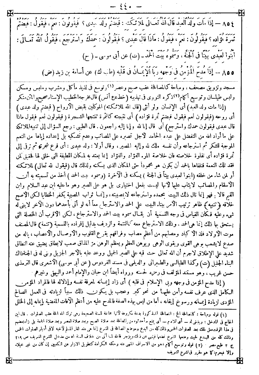 854 - (إذا مات ولد العبد) أي الإنسان ولو أثنى (قال الله لملائكته) الموكلين بقبض الأرواح (قبضتم ولد عبدي) أي روحه (فيقولون نعم فيقول قبضتم ثمرة قؤاده) أي نتيجته كالثمرة تنتجها الشجرة (فيقولون نعم فيقول ماذا قال عبدي فيقولون حمدك واسترجع) أي قال إنا لله وإنا إليه راجعون. قال الطيبي: رجع السؤال إلى تنبيه الملائكة على ما أراد اله من التفضل على عبده الحامد لأجل تصبره على المصائب وعدم تشكيه بل إعداده إياها من النعم الموجبة للشكر ثم استرجاعه وأن نفسه ملك لله وإليه المصير وقال أولا: ولد عبدي: أي فرع شجرته ثم ترقى إلى ثمرة فؤاده أي نقاوة خلاصته فإن خلاصة المرء الفؤاد إنما يعتد به لمكان اللطيفة التي خلق لها فحقيق لمن فقد تلك النعمة فتلقاها بالحمد أن يكون هو محمودا حتى المكان الذي يسكنه ولذلك قال (فيقول الله تعالى) لملائكته) أو لمن شاء من خلقه (ابنوا لعبدي بيتا في الجنة) يسكنه في الآخرة (وسموه بيت الحمد) أخذ من تسميته به أن الأسقام والمصائب لا يثاب عليها لأنها ليست بفعل اختياري بل هو على الصبر وهو ما عليه ابن السلام وابن القيم قالا: فهو إنما نال ذلك البيت بحمده واسترجاعه لا بمصيبته وإنما ثواب المصيبة يكفر الخطايا لكن الأصح خلافه