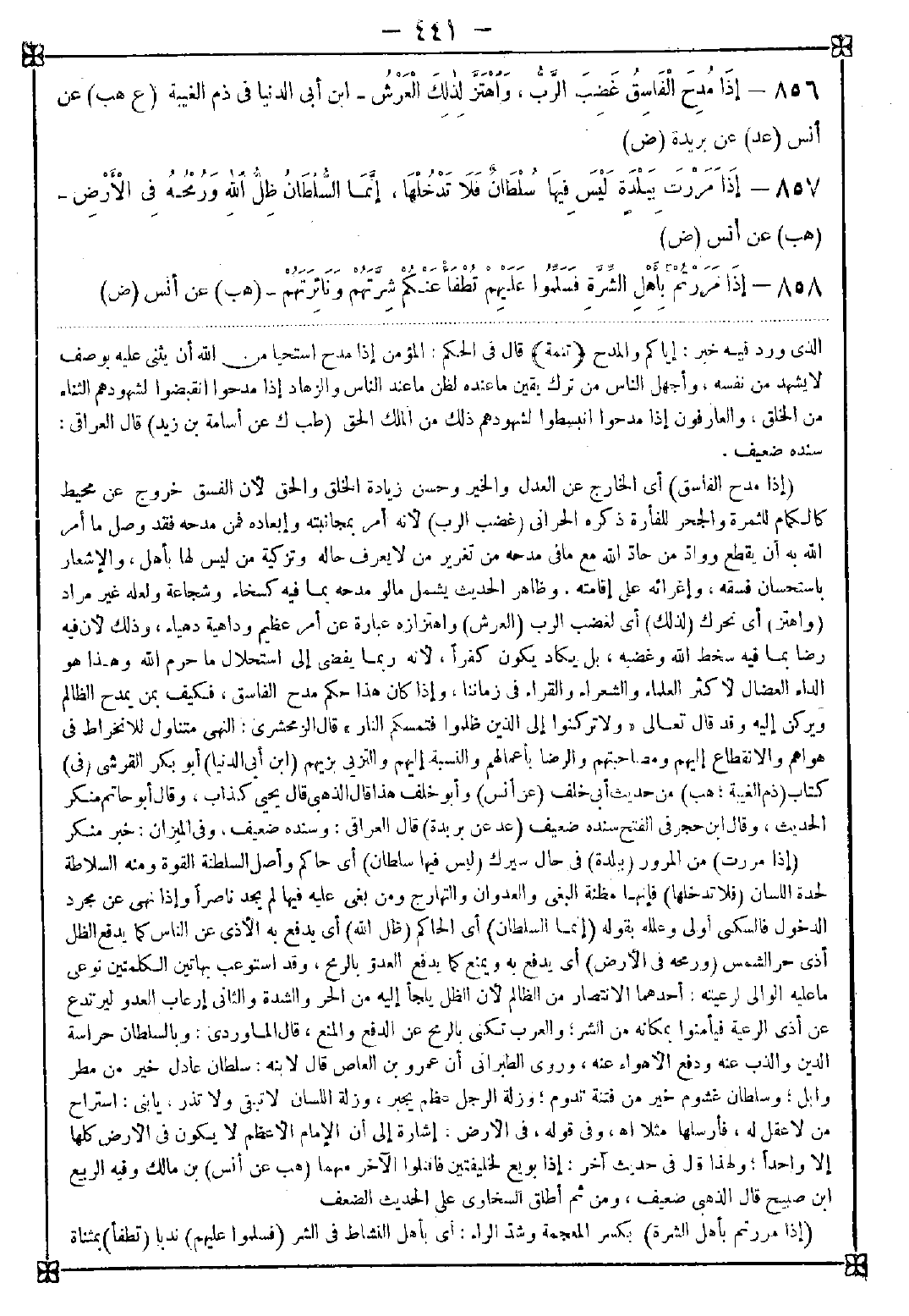 856 - (إذا مدح الفاسق) أي الخارج عن العدل والخبر وحسن زيادة الخلق والحق لأن الفسق خروج عن محيط كالكمام للثمرة والجحر للفأرة ذكره الحراني (غضب الرب) لأنه أمر بمجانبته وإبعاده فمن مدحه فقد وصل ما أمر الله به أن يقطع وواد من حاد الله مع ما في مدحه من تغرير من لا يعرف حاله وتزكية من ليس لها بأهل والإشعار باستحسان فسقه وإغرائه على إقامته. وظاهر الحديث يشمل ما لو مدحه بما فيه كسخاء وشجاعة ولعله غير مراد (واهتز) أي تحرك (لذلك) أي لغضب الرب (العرش) واهتزازه عبارة عن أمر عظيم وداهية دهياء وذلك لأن فيه رضا بما فيه سخط الله وغضبه بل يكاد يكون كفرا لأنه ربما يفضي إلى استحلال ما حرم الله وهذا هو الداء العضال لأكثر العلماء والشعراء والقراء في زماننا وإذا كان هذا حكم مدح الفاسق فكيف بمن يمدح الظالم ويركن إليه وقد قال تعالى {ولا تركنوا إلى الذين ظلموا فتمسكم النار} قال الزمخشري: النهي متناول للانخراط في هواهم والانقطاع إليهم ومصاحبتهم والرضا بأعمالهم والنسبة إليهم والتزيي بزيهم