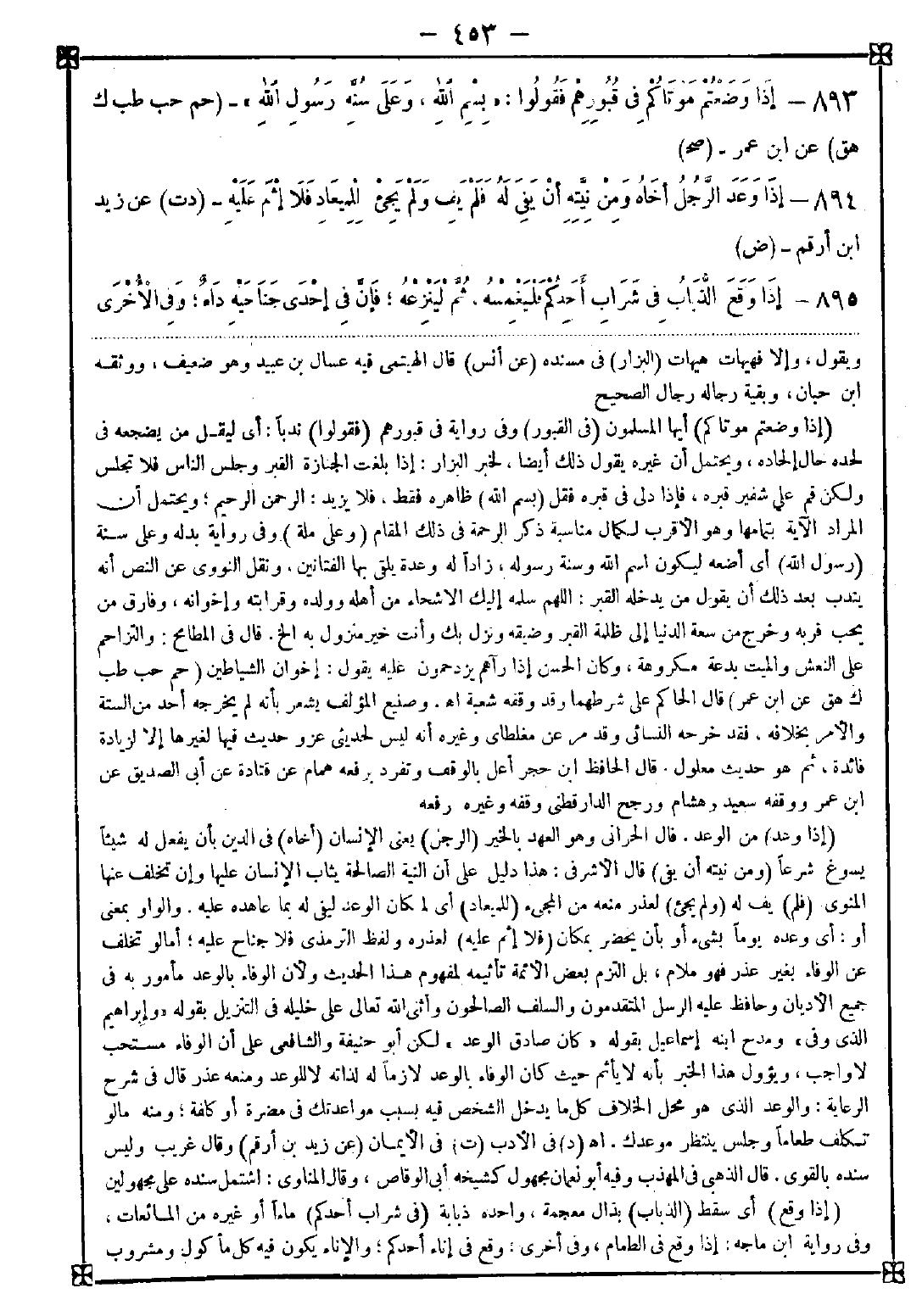 893 - (إذا وضعتم موتاكم) أيها المسلمون (في القبور) وفي رواية في قبورهم (فقولوا) ندبا أي ليقل من يضجعه في لحده حال إلحاده ويحتمل أن غيره يقول ذلك أيضا لخبر البزار: إذا بلغت الجنازة وجلس الناس فلا تجلس ولكن ولكن قم على شفير قبره فإذا دلى في قبره فقل (بسم الله) ظاهره فقط فلا يزيد: الرحمن الرحيم ويحتمل أن المراد الآية بتمامها وهو الأقرب لكمال مناسبة ذكر الرحمة في ذلك المقام (وعلى ملة) وفي رواية بدله وعلى سنة (رسول الله) أي أضعه ليكون اسم الله وسنة رسوله زادا له وعدة يلقى بها الفتانين ونقل النووي عن النص أنه يندب بعد ذلك أن يقول من يدخله القبر: اللهم سلمه إليك الأشحاء من أهله وولده وقرابته وإخوانه وفارق من يحب قربه وخرج من سعة الدنيا إلى ظلمة القبر وضيقه ونزل بك وأنت خير منزول إلخ. قال في المطامح: والتزاحم على النعش والميت بدعة مكروهة وكان الحسن إذا رآهم يزدحمون عليه يقول: إخوان الشياطين