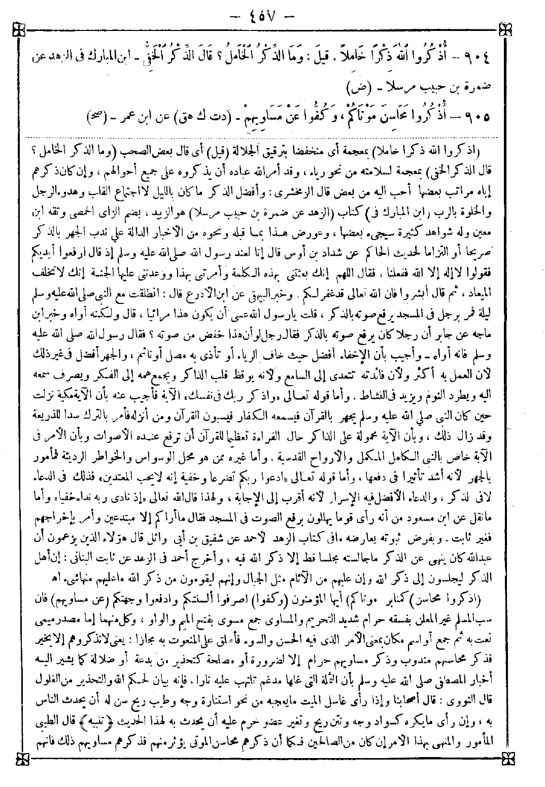 -[457]- 904 - (اذكروا الله ذكرا خاملا) بمعجمة أي منخفضا بترقيق الجلالة (قيل) أي بعض الصحب (وما الذكر الخامل؟ قال الذكر الخفي) بمعجمة لسلامته من نحو رياء وقد أمر الله عباده أن يذكروه على جميع أحوالهم وإن كان ذكرهم إياه مراتب بعضها أحب إليه من بعض. قال الزمخشري: وأفضل الذكر ما كان بالليل لا اجتماع القلب وهدوء الرجل والخلوة بالرب