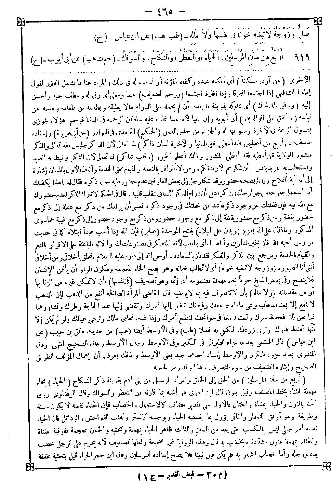 919 - (أربع من سنن المرسلين) من الحق إلى الخلق والمراد الرسل من بني آدم بقرينة ذكر النكاح (الحياء) بحاء مهملة فمثناة بخط المصنف وقيل بنون قال ابن العربي هو أشبه بما قارنه من التعطر والسواك وقال البيضاوي روى الحنا بالنون والحياء بمثناة والختان فالأول على تقدير مضاف كالاستعمال والخضاب فإن الحناء نفسه لا يكون سنة وطريقة وهو أوفق للتعطر والثاني يؤول بما يقتضيه الحياء ويوجبه كالستر وتجنب الفواحش والرذائل فإن الحياء نفسه أمر جبلي ليس بالكسب حتى يعد من السنن والثالث ظاهر الحياء بمهملة وتحتية والختان بمعجمة ففوقية مثناة والحناء بمهملة فنون مشددة ما يخضب به قال وهذه الرواية غير صحيحة ولعلها تصحيف لأنه يحرم على الرجل خضب يده ورجله وأما خضاب الشعر فلم يكن قبل نبينا فلا يصح إسناده للمرسلين وقال ابن حجر الحياء قيل بتحتية مخففة -[466]- وقد ثبت أن الحياء من الإيمان وقيل بنون فعلى الأول هي خصلة معنوية تتعلق بتحسين الخلق وعلى الثاني حسية تتعلق بتحسين البدن وقال شيخه الزين العراقي بعد حكايته إنه بتحتية أو نون وكلاهما غلط والصواب الختان فوقعت النون في الهامش فذهبت فاختلف في لفظه وهو أولى منهما إذ الحياء خلق والحنا ليس من السنن ولا ذكره المصطفى في خصال الفطرة بخلاف الختان فإن إبراهيم عليه الصلاة والسلام أمر به واستمر بعده في الرسل وأتباعهم حتى المسيح عليه السلام فإنه اختتن انتهى وتقدمه لنحوه ابن القيم فنقل في الهدى عن المزي أن صوابه الختان وسقطت النون قال وهكذا رواه المحاملي عن شيخه الترمذي (والتعطر) استعمال العطر وهو الطيب فإنه يزكي الفؤاد ويقوي القلب والجوارح وهم محتاجون إلى ذلك لثقل الوحي {إنا سنلقي عليك قولا ثقيلا} (والنكاح) الوطء لأن النور يملأ قلوبهم فيفيض في العروق فيكون ريح الشهوة فيحدث ريح القوة وشاهد ذلك من الكتاب {ولقد أرسلنا رسلا من قبلك وجعلنا لهم أزواجا وذرية} (والسواك) لأن الفم طريق لكتاب الله المنزل عليهم ومحل لمناجاة الملك فيتأكد في حقهم أكثر <تنبيه> هذا الحديث ظاهره مشكل فإن نوحا أول الرسل كما يأتي في خبر ولم يختتن إذ أول من اختتن إبراهيم كما مر في الخبر وعيسى لم يتزوج وكونه يتزوج بعد نزوله بفرض تسليم وروده غير دافع للشبهة فإنه إنما ينزل محمديا عالما بأحكام هذه الملة ولا مخلص من ذلك إلا بأن يقال المراد بالمرسلين أكثرهم