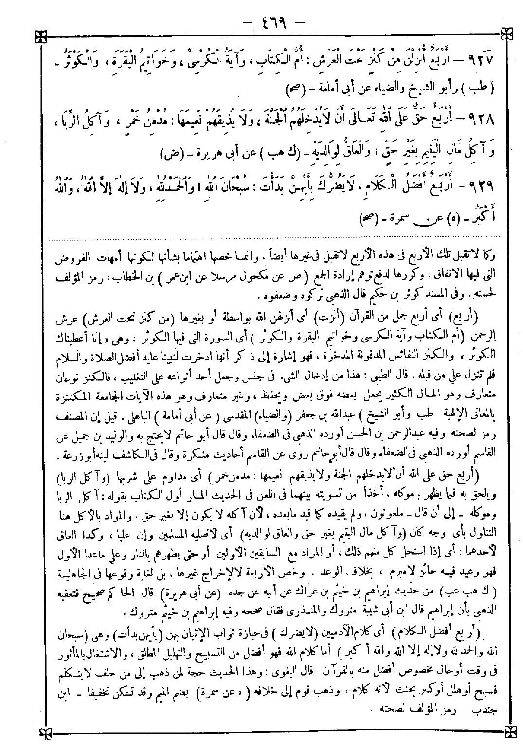 929 - (أربع أفضل الكلام) أي كلام الآدميين (لا يضرك) في حيازة ثواب الإتيان بهن (بأيهن بدأت) وهي (سبحان الله والحمد لله ولا إله إلا الله والله أكبر) أما كلام الله فهو أفضل من التسبيح والتهليل المطلق والاشتغال بالمأثور في وقت أو حال مخصوص أفضل منه بالقرآن