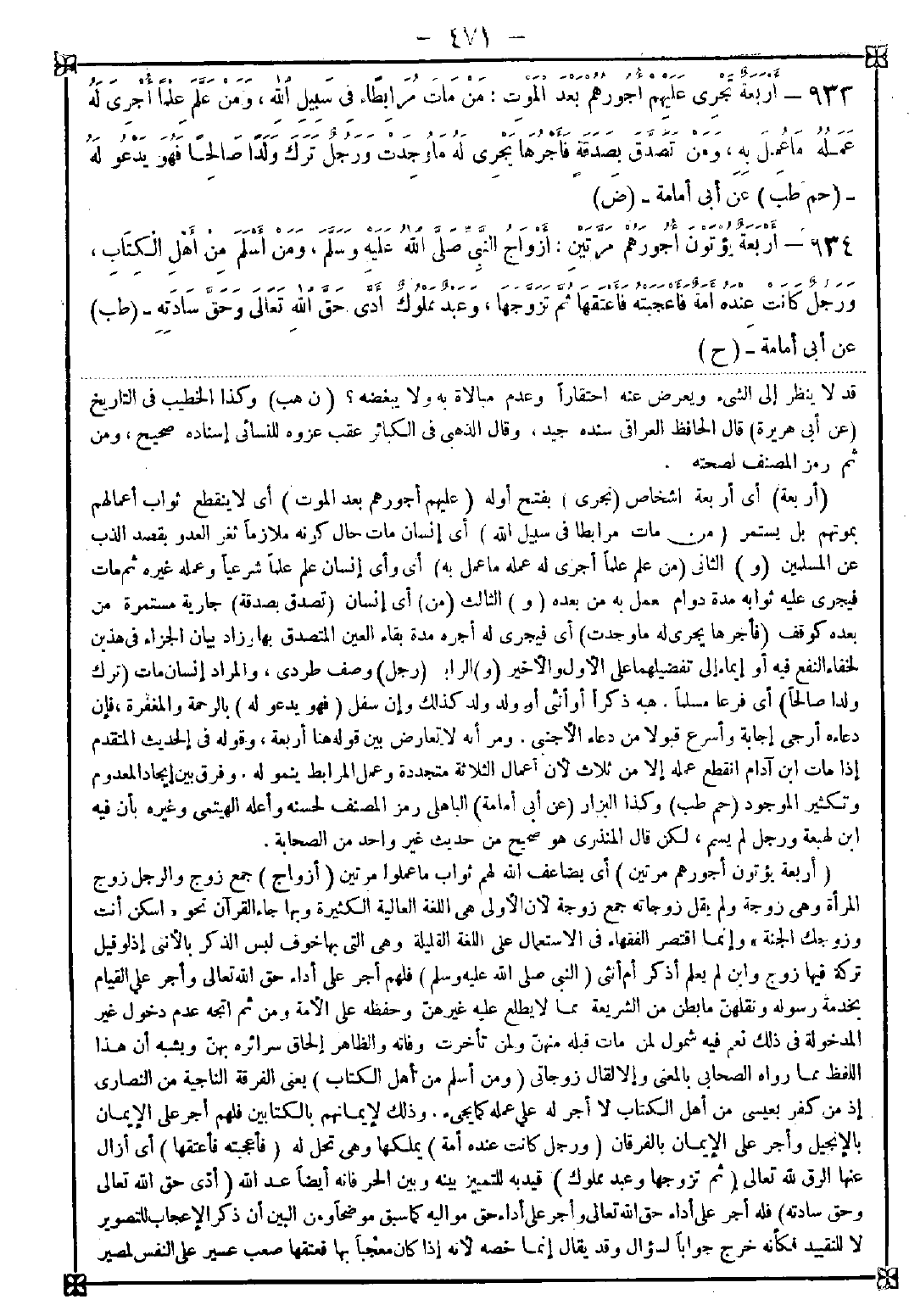 933 - (أربعة) أي أربعة أشخاص (تجري) بفتح أوله (عليهم أجورهم بعد الموت) أي لا ينقطع ثواب أعمالهم بموتهم بل يستمر (من مات مرابطا في سبيل الله) أي إنسان مات حال كونه ملازما ثغر العدو بقصد الذب عن المسلمين (و) الثاني (من علم علما أجرى له عمله ما عمل به) أي وأي إنسان علم علما وعمله غيره ثم مات فيجري عليه ثوابه مدة دوام العمل به من بعده (و) الثالث (من) أي إنسان (تصدق بصدقة) جارية مستمرة من بعده كوقف (فأجرها يجري له ما وجدت) أي فيجري له أجره مدة بقاء العين المتصدق بها وزاد بيان الجزاء في هذين لخفاء النفع فيه أو إيماء إلى تفضيلهما على الأول والأخير (و) الرابع (رجل) وصف طردي والمراد إنسان مات (ترك ولدا صالحا) أي فرعا مسلما