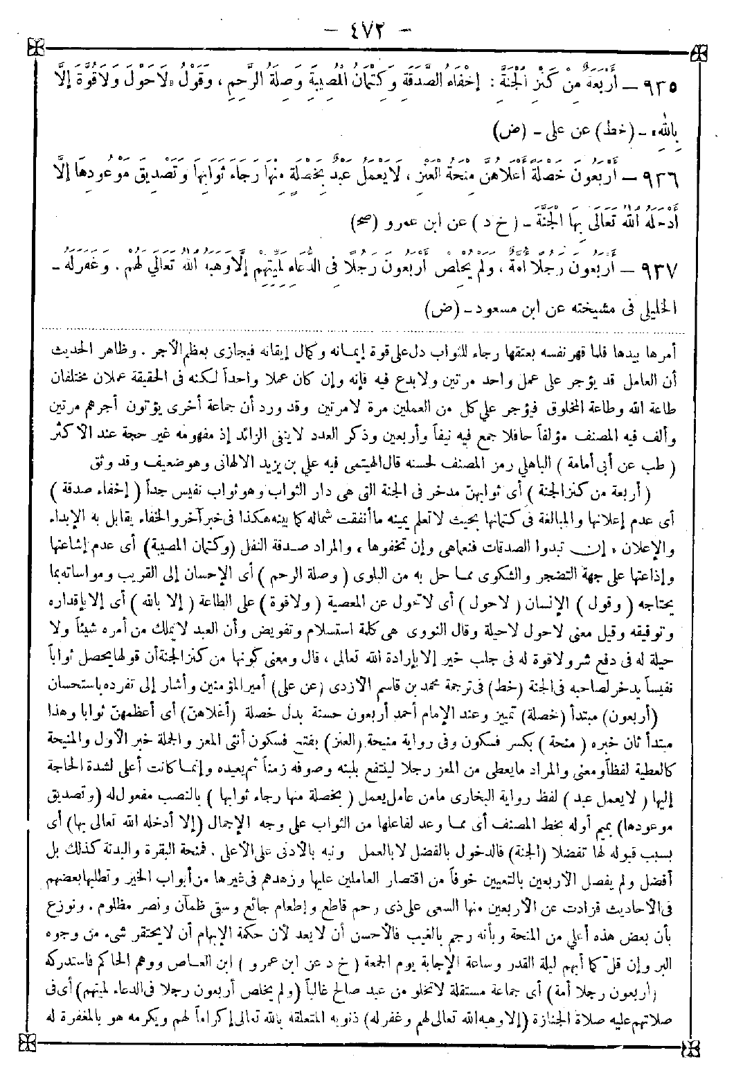 935 - (أربعة من كنز الجنة) أي ثوابهن مدخر في الجنة التي هي دار الثواب وهو ثواب نفيس جدا (إخفاء صدقة) أي عدم إعلانها والمبالغة في كتمانها بحيث لا تعلم يمينه ما أنفقت شماله كما بينه هكذا في خبر آخر والخفاء يقابل به الإبداء والإعلان {إن تبدوا الصدقات فنعما هي وإن تخفوها} والمراد صدفة النفل (وكتمان المصيبة) أي عدم إشاعتها وإذاعتها على جهة التضجر والشكوى مما حل به من البلوى (وصلة الرحم) أي الإحسان إلى القريب ومواساته بما يحتاجه (وقول) الإنسان (لا حول) أي لا تحول عن المعصية (ولا قوة) على الطاعة (إلا بالله) أي إلا بإقداره وتوفيقه وقيل معنى لا حول لا حيلة وقال النووي: هي كلمة استسلام وتفويض وأن العبد لا يملك من أمره شيئا ولا حيلة له في دفع شر ولا قوة له في جلب خير إلا بإرادة الله تعالى قال: ومعنى كونها من كنز الجنة أن قولها يحصل ثوابا نفيسا يدخر لصاحبه في الجنة