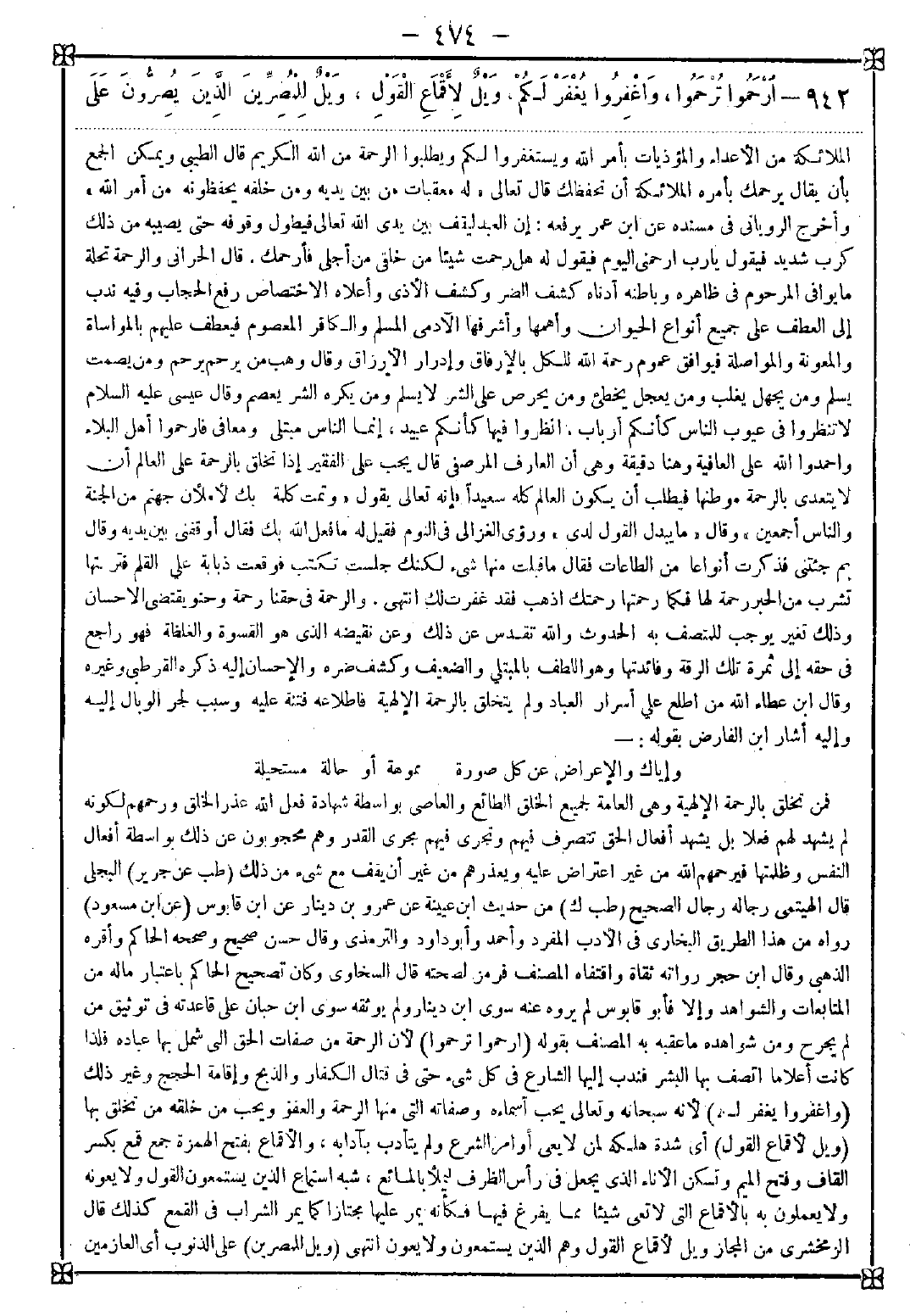 942 - (ارحموا ترحموا) لأن الرحمة من صفات الحق التي شمل بها عباده فلذا كانت أعلاما اتصف بها البشر فندب إليها الشارع في كل شيء حتى في قتال الكفار والذبح وإقامة الحجج وغير ذلك (واغفروا يغفر لكم) لأنه سبحانه وتعالى يحب أسمائه وصفاته التي منها الرحمة والعفو ويحب من خلقه من تخلق بها (ويل لأقماع القول) أي شدة هلكة لمن لا يعي أوامر الشرع ولم يتأدب بآدابه والأقماع بفتح الهمزة جمع قمع بكسر القاف وفتح الميم وتسكن الإناء الذي يجعل في رأس الظرف ليملأ بالمائع شبه استماع الذين يستمعون القول ولا يعونه ولا يعملون به بالأقماع التي لا تعي شيئا مما يفرغ فيها فكأنه يمر عليها مجتازا كما يمر الشراب في القمع كذلك قال الزمخشري: من المجاز ويل لأقماع القول وهم الذين يستمعون ولا يعون انتهى (ويل للمصرين) على الذنوب أي العازمين -[475]- على المداومة عليها (الذين يصرون على ما فعلوا) يقيمون عليها فلم يتوبوا ولم يستغفروا (وهم يعلمون) حال أي يصرون في حال علمهم بأن ما فعلوه معصية أو يعلمون بأن الإصرار أعظم من الذنب أو يعلمون بأنه يعاقب على الذنب