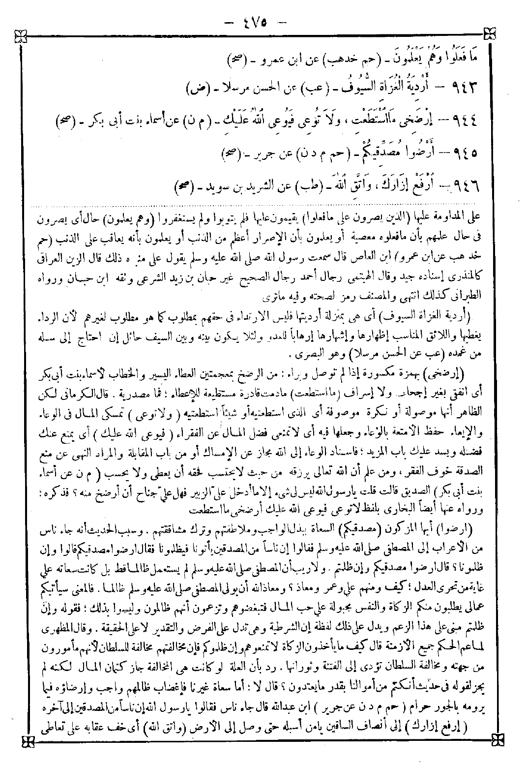 945 - (ارضوا) أيها المزكون (مصدقيكم) السعاة ببذل الواجب وملاطفتهم وترك مشاقهم. وسبب الحديث أنه جاء ناس من الأعراب إلى المصطفى صلى الله عليه وسلم فقالوا إن ناسا من المصدقين يأتونا فيظلمونا فقال ارضوا مصدقيكم قالوا وإن ظلمونا؟ قال ارضوا مصدقيكم وإن ظلمتم. ولا ريب أن المصطفى صلى الله عليه وسلم لم يستعمل ظالما قط بل كانت سعاته على غاية من تحري العدل كيف ومنهم علي وعمر ومعاذ؟ ومعاذ الله أن يولي المصطفى صلى الله عليه وسلم ظالما. فالمعنى سيأتيكم عمالي يطلبون منكم الزكاة والنفس مجبولة على حب المال فتبغضوهم وتزعمون أنهم ظالمون وليسوا بذلك. فقوله وإن ظلمتم مني على هذا الزعم ويدل على ذلك لفظة إن الشرطية وهي تدل على الفرض والتقدير لا على الحقيقة. وقال المظهري: لما عم الحكم جميع الأزمنة قال كيف ما يأخذون الزكاة لا تمنعوهم وإن ظلموكم فإن مخالفتهم مخالفة للسلطان لأنهم مأمورون من جهته ومخالفة السلطان تؤدي إلى الفتنة وثورانها. رد بأن العلة لو كانت هي المخالفة جاز كتمان المال لكنه لم يجز لقوله في حديث أنكتم من أموالنا بقدر ما يعتدون؟ قال لا. أما سعاة غيرنا فإغضاب ظالمهم واجب وإرضاؤه فيما يرمونه بالجور حرام