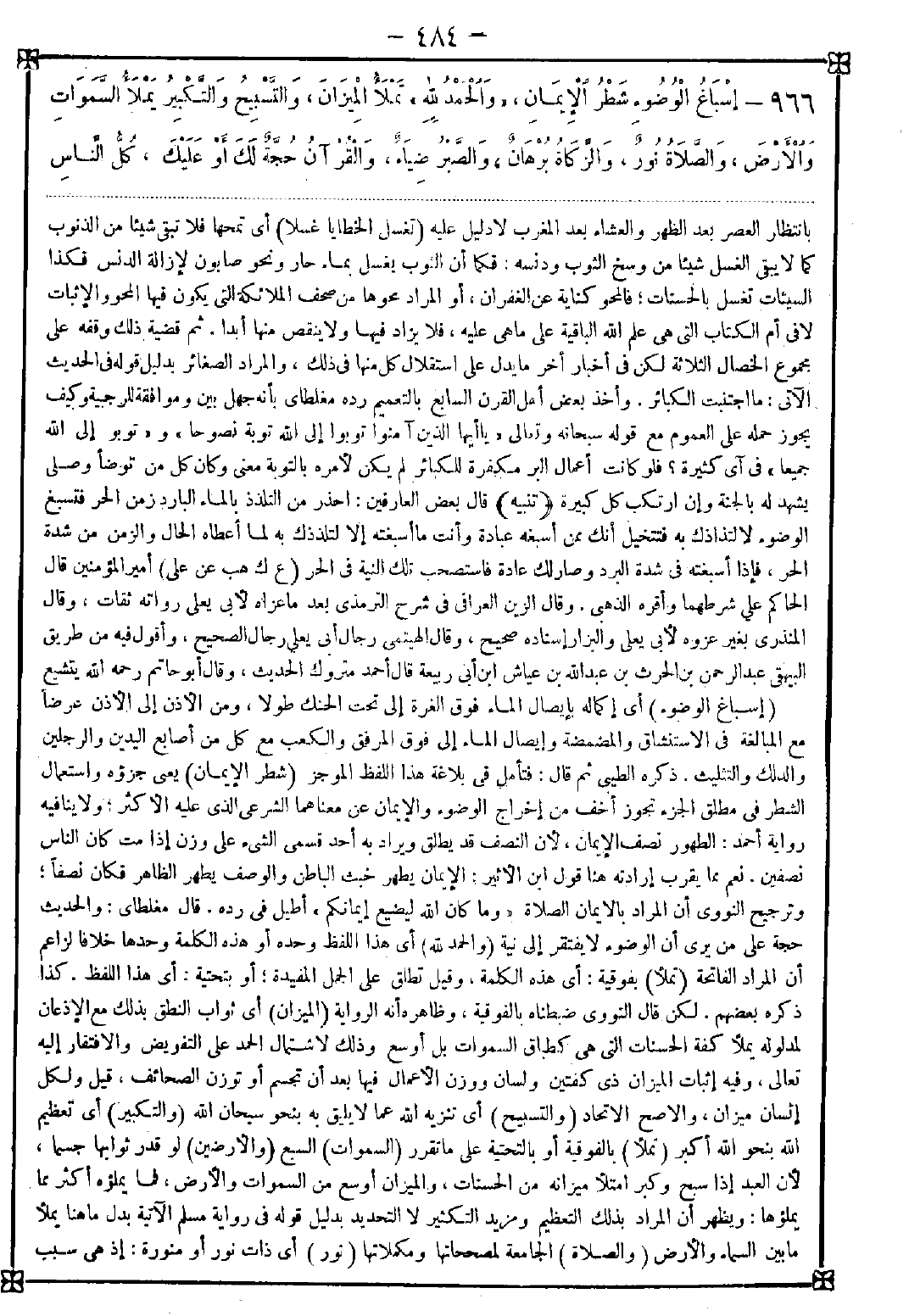 966 - (إسباغ الوضوء) أي إكماله بإيصال الماء فوق الغرة إلى تحت الحنك طولا ومن الأذن إلى الأذن عرضا مع المبالغة في الاستنشاق والمضمضة وإيصال الماء إلى فوق المرفق والكعب مع كل من أصابع اليدين والرجلين والدلك والتثليث. ذكره الطيبي ثم قال: فتأمل في بلاغة هذا اللفظ الموجز (شطر الإيمان) يعني جزؤه واستعمال الشطر في مطلق الجزء تجوز أخف من إخراج الوضوء والإيمان عن معناهما الشرعي الذي عليه الأكثر ولا ينافيه رواية أحمد: الطهور نصف الإيمان لأن النصف قد يطلق ويراد به أحد قسمي الشيء على وزن إذا مت كان الناس نصفين. نعم مما يقرب إرادته هنا قول ابن الأثير: الإيمان يطهر خبث الباطن والوصف يطهر الظاهر فكان نصفا وترجيح النووي أن المراد بالإيمان الصلاة {وما كان الله ليضيع إيمانكم} أطيل في رده. قال مغلطاي: والحديث حجة على من يرى أن الوضوء لا يفتقر إلى نية (والحمد لله) أي هذا اللفظ وحده أو هذه الكلمة وحدها خلافا لزاعم أن المراد الفاتحة (تملأ) بفوقية: أي هذه الكلمة وقيل تطلق على الجمل المفيدة أو بتحتية: أي هذا اللفظ. كذا ذكره بعضهم