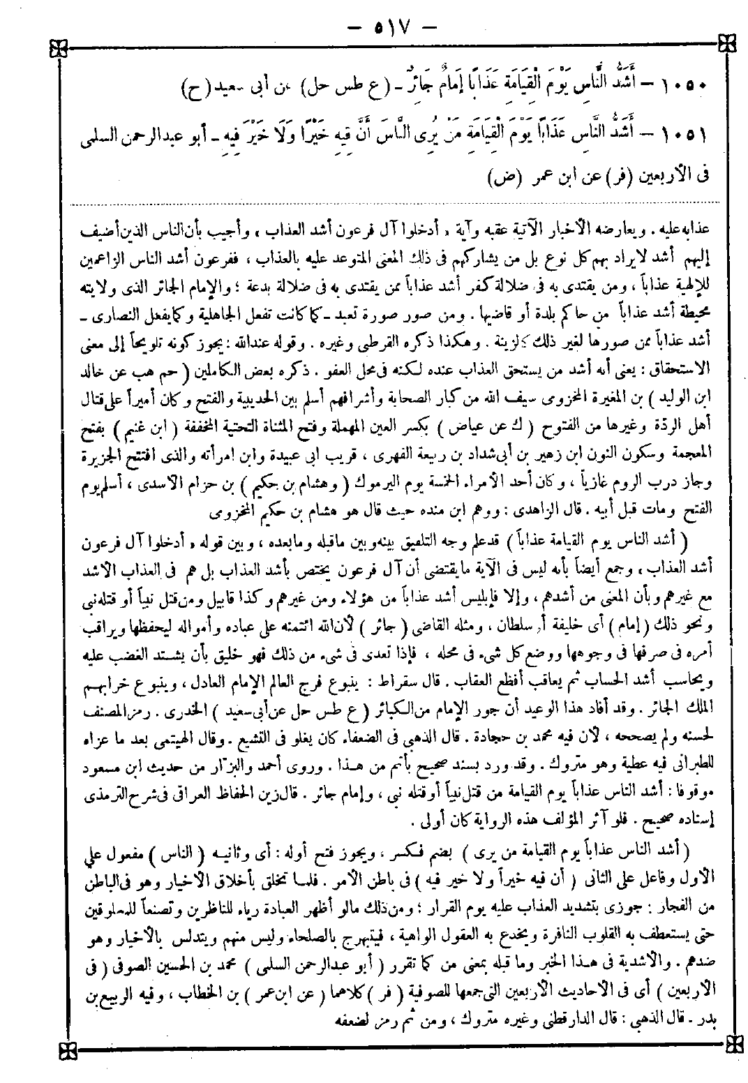 1050 - (أشد الناس يوم القيامة عذابا) قد علم وجه التلفيق بينه وبين ما قبله وما بعده وبين قوله {أدخلوا آل فرعون أشد العذاب} وجمع أيضا بأنه ليس في الآية ما يقتضي أن آل فرعون يختص بأشد العذاب بل هم في العذاب الأشد مع غيرهم وبأن المعنى من أشدهم وإلا فإبليس أشد عذابا من هؤلاء ومن غيرهم وكذا قابيل ومن قتل نبيا أو قتله نبي ونحو ذلك (إمام) أي خليفة أو سلطان ومثله القاضي (جائر) لأن الله ائتمنه على عباده وأمواله ليحفظها ويراقب أمره في صرفها في وجوهها ووضع كل شيء في محله فإذا تعدى في شيء من ذلك فهو خليق بأن يشتد الغضب عليه ويحاسب أشد الحساب ثم يعاقب أفظع العقاب