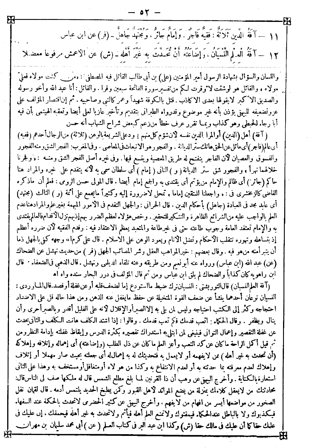 11 - (آفة) أهل (الدين) أو المرا الدين نفسه لأن شؤم كل منهم يعود على الشريعة بالوهن (ثلاثة) من الرجال أحدهم (فقيه) أي عالم (فاجر) أي مائل عن الحق هاتك ستر الديانة. والفجور هو الانبعاث في المعاصي. وفي المغرب: الفجر الشق ومنه الفجور والفسوق والعصيان لأن الفاجر ينفتح له طريق المعصية ويتسع فيها. وفي غيره أصل الفجر الشق ومنه: {وفجرنا خلالهما نهرا} والفجور شق ستر الديانة (و) الثاني (إمام) أي سلطان سمي به لأنه يتقدم على غيره والمراد هنا حاكم (جائر) أي ظالم والإمام من يؤتم أي يقتدى به والجمع إمام أيضا. قال المولى حسن الرومي: فعلم أن ما ذكره القاضي كالزمخشري في: {واجعلنا للمتقين إماما} تمحل لا ضرورة إليه وكثيرا ما يجتمع على أئمة (و) الثالث (مجتهد) أي عابد مجد في العبادة (جاهل) بأحكام الدين. قال الحراني: والجهل التقدم في الأمور المبهمة بغير علم والمراد هنا عدم العلم بالواجب عليه من الشرائع الظاهرة والتنكير للتحقير. وخص هؤلاء لعظم الضرر بهم إذ بهم تزل الأقدام فالعالم يقتدى به والإمام تعتقد العامة وجوب طاعته حتى في غير طاعة والمتعبد يعظم الاعتقاد فيه. وقدم الفقيه لأن ضرره أعظم إذ بتساهله وتهوره تنقلب الأحكام وتضل الأنام ويعود الوهن على الإسلام. قال علي كرم الله وجهه كفى بالجهل ذما أن يتبرأ منه من هو فيه. وقال بعضهم: خير المواهب العقل وشر المصائب الجهل