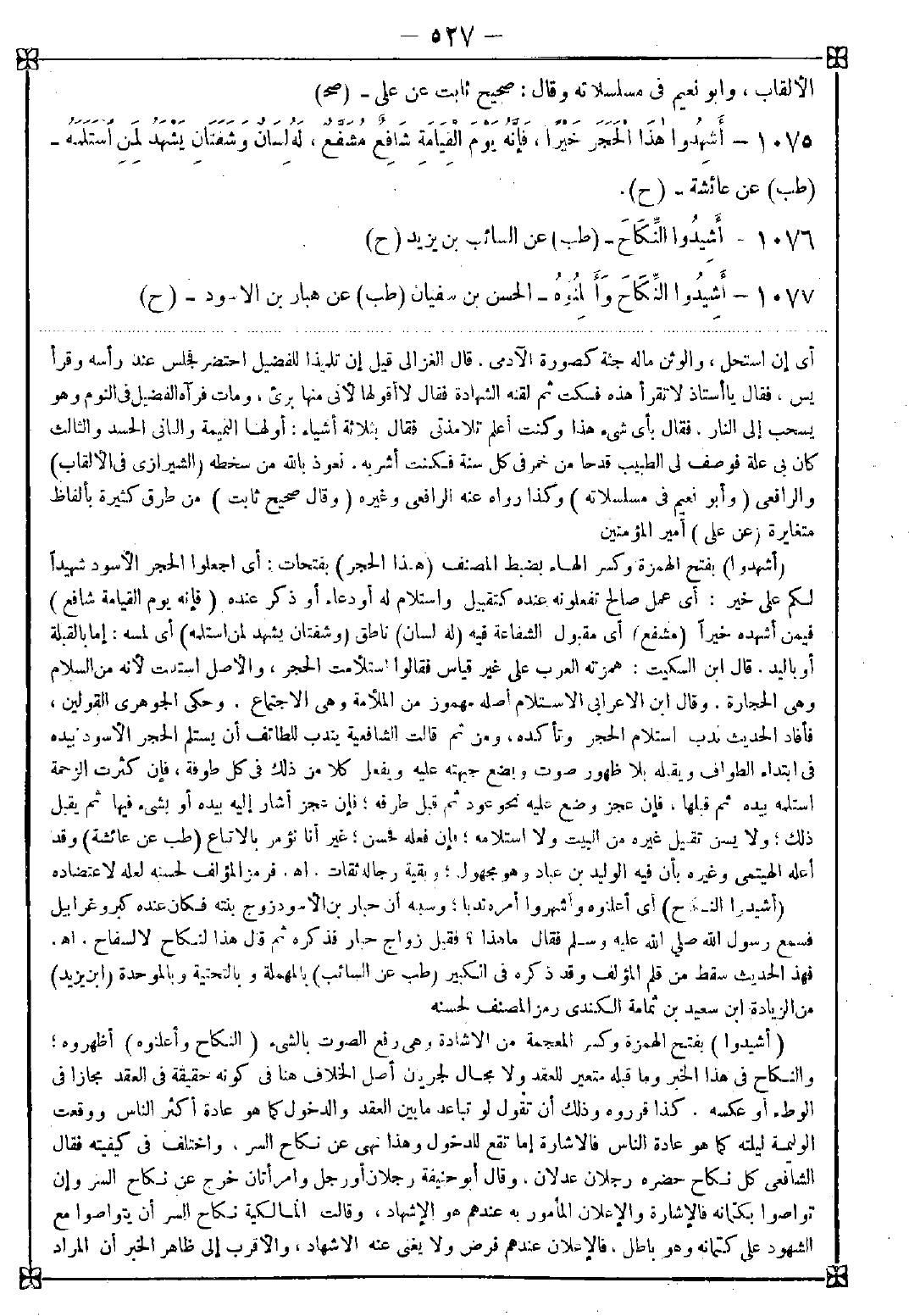 1075 - (أشهدوا) بفتح الهمزة وكسر الهاء بضبط المصنف (هذا الحجر) بفتحات: أي اجعلوا الحجر الأسود شهيدا لكم على خير: أي عمل صالح تفعلونه عنده كتقبيل واستلام له أو دعاء أو ذكر (فإنه يوم القيامة شافع) فيمن أشهده خيرا (مشفع) أي مقبول الشفاعة فيه (له لسان) ناطق (وشفتان يشهد لمن استلمه) أي لمسه: إما بالقبلة أو باليد: قال ابن السكيت: همزته العرب على غير قياس فقالوا استلأمت الحجر والأصل استلمت لأنه من السلام وهي الحجارة. وقال ابن الاعرابي الاستلام أصله مهموز من الملأمة وهي الاجتماع. وحكى الجوهري القولين فأفاد الحديث ندب استلام الحجر وتأكده ومن ثم قالت الشافعية يندب للطائف أن يستلم الحجر الأسود بيده في ابتداء الطواف ويقبله بلا ظهور صوت ويضع جبهته عليه ويفعل كلا من ذلك في كل طوفة فإن كثرت الزحمة استلمه بيده ثم قبلها فإن عجز وضع عليه نحو عود ثم قبل طرفه فإن عجز أشار إليه بيده أو بشيء فيها ثم يقبل ذلك ولا يسن تقبيل غيره من البيت ولا استلامه فإن فعله فحسن غير أنا نؤمر بالاتباع