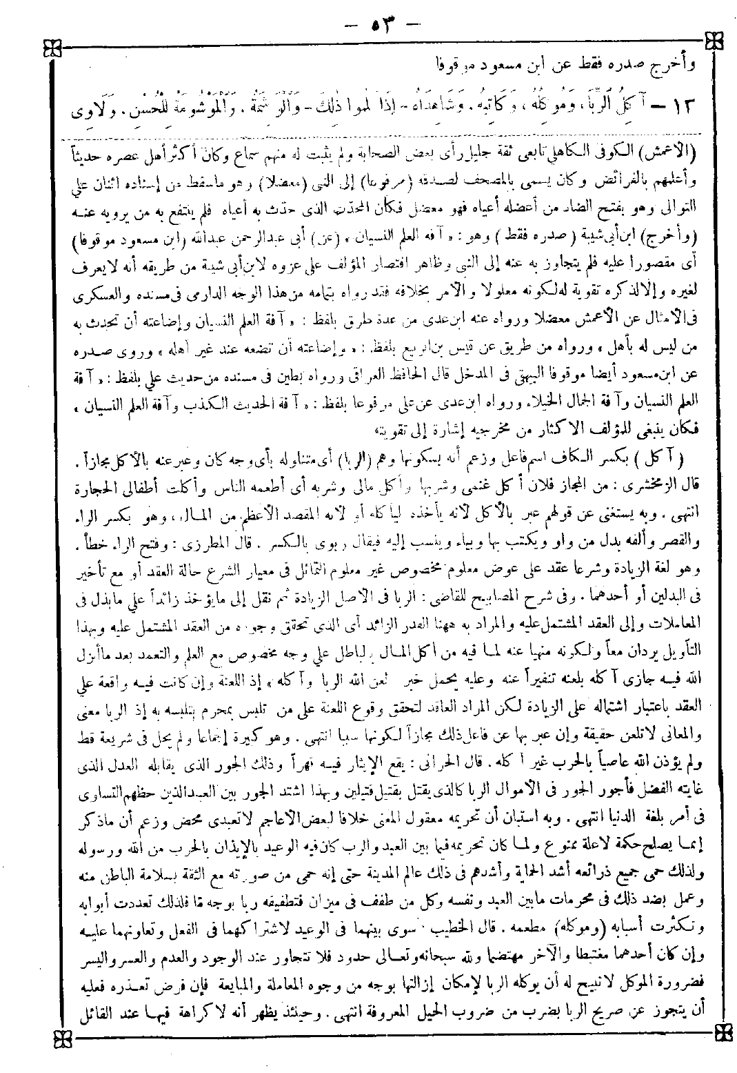 13 - (آكل) بكسر الكاف اسم فاعل وزعم أنه بسكونها وهم (الربا) أي متناوله بأي وجه كان وعبر عنه بالأكل مجازا. قال الزمخشري: من المجاز فلان أكل غنمي وشربها وأكل مالي وشربه أي أطعمه الناس وأكلت أطفالي الحجارة انتهى. وبه يستغنى عن قولهم عبر بالأكل لأنه يأخذه ليأكله أو لأنه المقصد الأعظم من المال وهو بكسر الراء والقصر وألفه بدل من واو ويكتب بها وبياء وينسب إليه فيقال ربوي بالكسر. قال المطرزي: وفتح الراء خطأ. وهو لغة الزيادة وشرعا عقد على عوض معلوم مخصوص غير معلوم التماثل في معيار الشرع حالة العقد أو مع تأخير في البدلين أو أحدهما. وفي شرح المصابيح للقاضي: الربا في الأصل الزيادة ثم نقل إلى ما يؤخذ زائدا علي ما بذل في المعاملات وإلى العقد المشتمل عليه والمراد به ههنا القدر الزائد أي الذي تحقق وجوده من العقد المشتمل عليه وبهذا التأويل يردان معا ولكونه منهيا عنه لما فيه من أكل المال بالباطل على وجه مخصوص مع العلم والتعمد بعد ما أنزل الله فيه جازي آكله بلغته تنفيرا عنه وعليه يحمل خبر " لعن الله الربا وآكله " إذ اللعنة وإن كانت فيه واقعة على العقد باعتبار اشتماله على الزيادة لكن المراد العاقد لتحقق وقوع اللعنة على من تلبس بمحرم بتلبسه به إذ الربا معنى والمعاني لا تلعن حقيقة وإن عبر بها عن فاعل ذلك مجازا لكونها سببا انتهى. وهو كبيرة إجماعا ولم يحل في شريعة قط ولم يؤذن الله عاصيا بالحرب غير آكله. قال الحراني: يقع الإيثار فيه قهرا وذلك الجور الذي يقابله العدل الذي غايته الفضل فأجور الجور في الأموال الربا كالذي يقتل بقتيل قتيلين وبهذا اشتد الجور بين العبيد الذين حظهم التساوي في أمر بلغة الدنيا انتهى. وبه استبان أن تحريمه معقول المعنى خلافا لبعض الأعاجم لا تعبدي محض وزعم أن ما ذكر إنما يصلح حكمة لا علة ممنوع ولما كان تحريمه فيما بين العبد والرب كان فيه الوعيد بالإيذان بالحرب من الله ورسوله ولذلك حمى جميع ذرائعه أشد الحماية وأشدهم في ذلك عالم المدينة حتى إنه حمى من صورته مع الثقة بسلامة الباطن منه وعمل بضد ذلك في محرمات ما بين العبد ونفسه وكل من طفف في ميزان فتطفيفه ربا بوجه ما فلذلك تعددت أبوابه وتكثرت أسبابه (وموكله) مطعمه