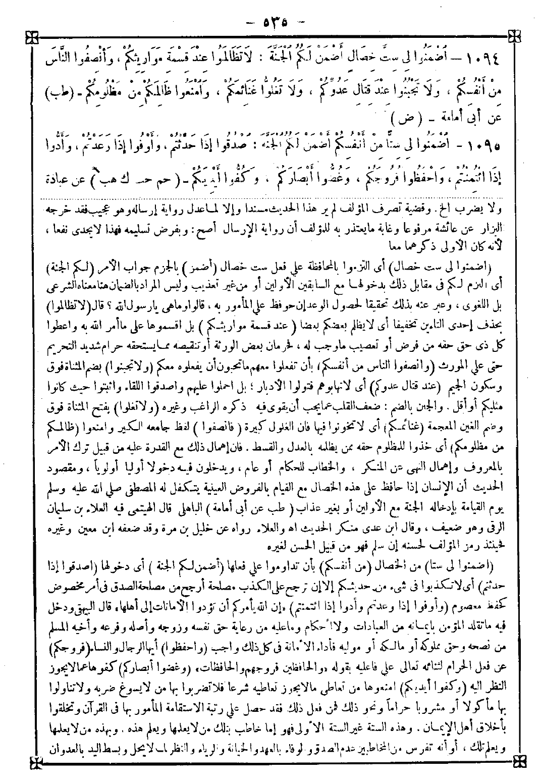 1095 - (اضمنوا لي ستا) من الخصال (من أنفسكم) بأن تداوموا على فعلها (أضمن لكم الجنة) أي دخولها (اصدقوا إذا حدثتم) أي لا تكذبوا في شيء من حديثكم إلا إن ترجح على الكذب مصلحة أرجح من مصلحة الصدق في أمر مخصوص كحفظ معصوم (وأوفوا إذا وعدتم وأدوا إذا ائتمنتم) {إن الله يأمركم أن تؤدوا الأمانات إلى أهلها} قال البيهقي ودخل فيه ما تقلد المؤمن بإيمانه من العبادات والأحكام وما عليه من رعاية حق نفسه وزوجه وأصله وفرعه وأخيه المسلم من نصحه وحق مملوكه أو مالكه أو موليه فأداء الأمانة في كل ذلك واجب (واحفظوا) أيها الرجال والنساء (فروجكم) عن فعل الحرام لثنائه تعالى على فاعليه بقوله {والحافظين فروجهم والحافظات} (وغضوا أبصاركم) كفوها عما لا يجوز النظر إليه (وكفوا أيديكم) امنعوها من تعاطي ما لا يجوز تعاطيه شرعا فلا تضربوا بها من لا يسوغ ضربه ولا تناولوا بها مأكولا أو مشروبا حراما ونحو ذلك فمن فعل ذلك فقد حصل على رتبة الاستقامة المأمور بها في القرآن وتخلقوا بأخلاق أهل الإيمان. وهذه الستة غير الستة الأولى فهو إما خاطب بتلك من لا يعلمها ويعلم هذه. وبهذه من لا يعلمها ويعلم تلك أو أنه تفرس من المخاطبين عدم الصدق والوفاء بالعهد والخيانة والرياء والنظر لما لا يحل وبسط اليد بالعدوان -[536]- فنهاهم وهكذا يقال فيما قبله. وأخرج البيهقي عن الفضيل قال أصل الإيمان عندنا وفرعه وداخله وخارجه بعد الشهادة بالتوحيد وللنبي بالبلاغ وأداء الفرائض: صدق الحديث وحفظ الأمانة وترك الخيانة والوفاء بالعهد وصلة الرحم والنصح للمسلمين قال سمعته وتعلمته من أهل الثقة ولو لم أجده ما قلته