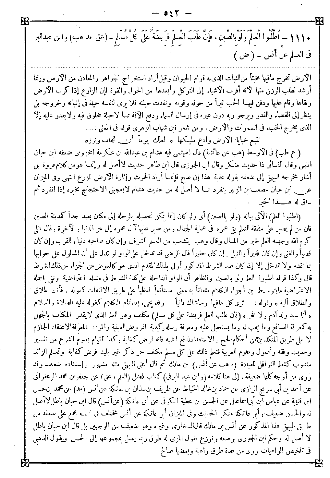 1110 - (اطلبوا العلم) الآتي بيانه (ولو بالصين) أي ولو كان إنما يمكن تحصيله بالرحلة إلى مكان بعيد جدا كمدينة الصين فإن من لم يصبر على مشقة التعلم بقي عمره في عماية الجهالة ومن صبر عليها آل عمره إلى عز الدنيا والآخرة وقال علي كرم الله وجهه العلم خير من المال وقال وهب يتشعب من العلم الشرف وإن كان صاحبه دنيا والقرب وإن كان قصيا والغنى وإن كان فقيرا والنبل وإن كان حقيرا قال الرضي قد تدخل على الواو لو تدل على أن المدلول على جوابها بما تقدم ولا تدخل إلا إذا كان ضد الشرط المذكور أولى بذلك المقدم الذي هو كالعوض عن الجزاء من ذلك الشرط قال وكذا قوله اطلبوا العلم ولو بالصين والظاهر أن الواو الداخلة على كلمة الشرط في مثله اعتراضية ونفي بالجملة الاعتراضية ما يتوسط بين أجزاء الكلام متعلقا به معنى مستأنفا لفظيا على طريق الالتفات كقوله. . . فأنت طلاق والطلاق ألية. . . وقوله:. . . ترى كل ما فيها وحاشاك فانيا