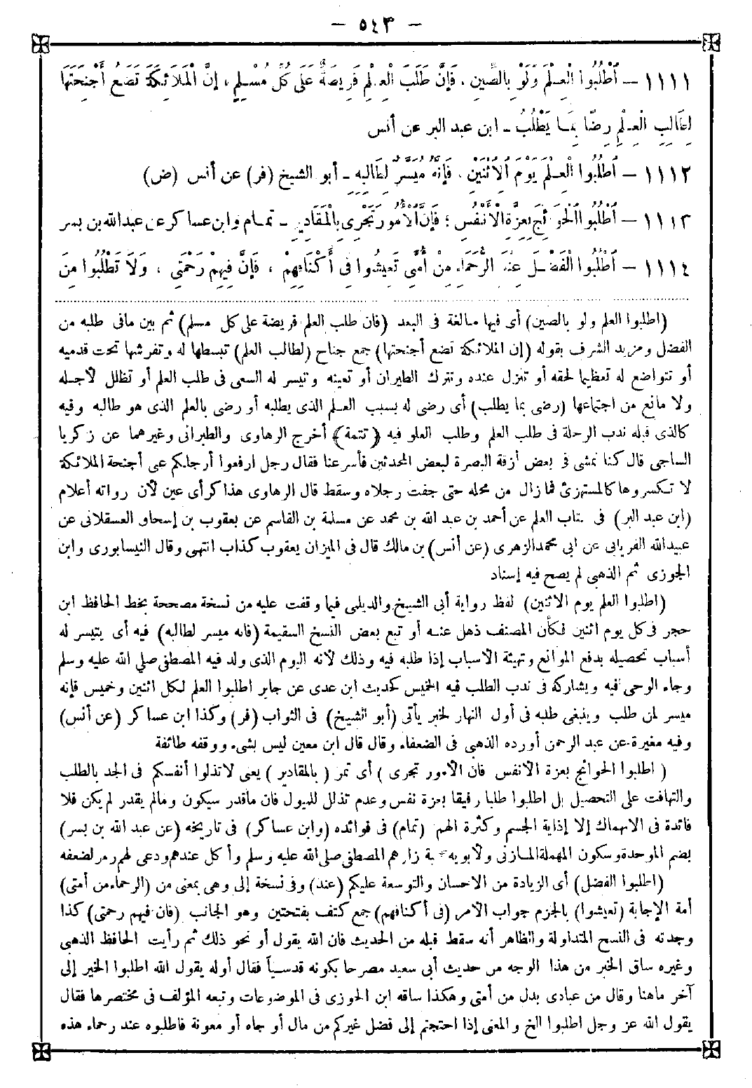 -[543]- 1111 - (اطلبوا العلم ولو بالصين) أي فيها مبالغة في البعد (فإن طلب العلم فريضة على كل مسلم) ثم بين ما في طلبه من الفضل ومزيد الشرف بقوله (إن الملائكة تضع أجنحتها) جمع جناح (لطالب العلم) تبسطها له وتفرشها تحت قدميه أو تتواضع له تعظيما لحقه أو تنزل عنده وتترك الطيران أو تعينه وتيسر له السعي في طلب العلم أو تظل لأجله ولا مانع من اجتماعها (رضى بما يطلب) أي رضى له بسبب العلم الذي يطلبه أو رضى بالعلم الذي هو طالبه وفيه كالذي قبله ندب الرحلة في طلب العلم وطلب العلو فيه (تتمة) أخرج الرهاوي والطبراني وغيرهما عن زكريا الساجي قال كنا نمشي في بعض أزقة البصرة لبعض المحدثين فأسرعنا فقال رجل ارفعوا أرجلكم عني أجنحة الملائكة لا تكسروها كالمستهزئ فما زال من محله حتى جفت رجلاه وسقط قال الرهاوي هذا كرأي عين لأن رواته أعلام