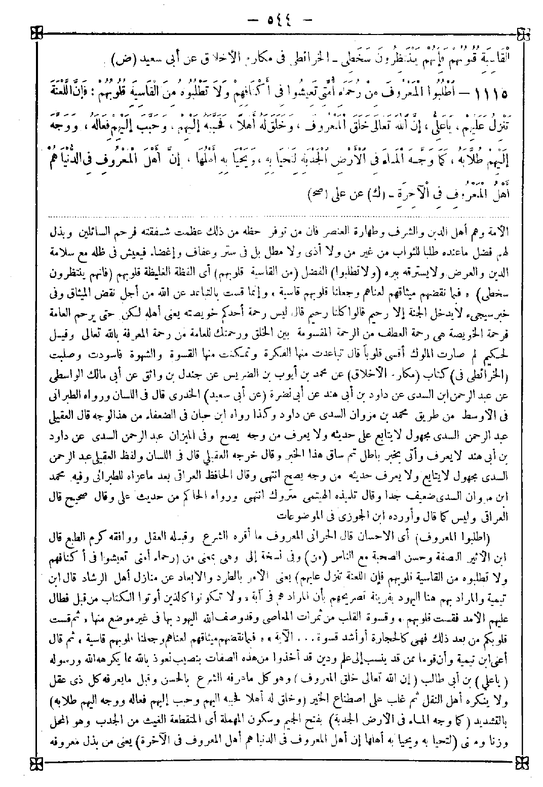1115 - (اطلبوا المعروف) أي الإحسان قال الحراني المعروف ما أقره الشرع وقبله العقل ووافقه كرم الطبع قال ابن الأثير النصفة وحسن الصحبة مع الناس (من) وفي نسخة إلى وهي بمعنى من (رحماء أمتي تعيشوا في أكنافهم ولا تطلبوه من القاسية قلوبهم فإن اللعنة تنزل عليهم) يعني الأمر بالطرد والابعاد عن منازل أهل الرشاد قال ابن تيمية والمراد بهم هنا اليهود بقرينة تصريحهم بأن المراد هم في آية {ولا تكونوا كالذين أوتوا الكتاب من قبل فطال عليهم الأمد فقست قلوبهم} وقسوة القلب من ثمرات المعاصي وقد وصف الله اليهود بها في غير موضع منها {ثم قست قلوبكم من بعد ذلك فهي كالحجارة أو أشد قسوة. . . الآية} {فبما نقضهم ميثاقهم لعناهم وجعلنا قلوبهم قاسية} ثم قال أعني ابن تيمية وأن قوما ممن قد ينسب إلى علم ودين قد أخذوا من هذه الصفات بنصيب نعوذ بالله مما يكرهه الله ورسوله (يا علي) بن أبي طالب (إن الله تعالى خلق المعروف) وهو كل ما عرفه الشرع بالحسن وقبل ما يعرفه كل ذي عقل ولا ينكره أهل النقل ثم غلب على اصطناع الخير (وخلق له أهلا فحببه إليهم وحبب إليهم فعاله ووجه إليهم طلابه) بالتشديد (كما وجه الماء في الأرض الجدبة) بفتح الجيم وسكون المهملة أي المتقطعة الغيث من الجدب وهو المحل وزنا ومعنى (لتحيا به ويحيا به أهلها إن أهل المعروف في الدنيا هم أهل المعروف في الآخرة) يعني من بذل معروفه -[545]- للناس في الدنيا آتاه الله جزاء معروفه في الأخرة والمراد من بذل جاهه لأهل الجرائم فشفع فيهم شفعه الله في أهل التوحيد في الآخرة ومفهوم الحديث أن أهل الشر في الدنيا هم أهل الشر في الآخرة <فائدة> في مستدرك الحاكم بسند عن أبي جعفر من وجد في قلبه قسوة فليكتب يس والقرآن السورة في جام بزعفران ثم يشربه