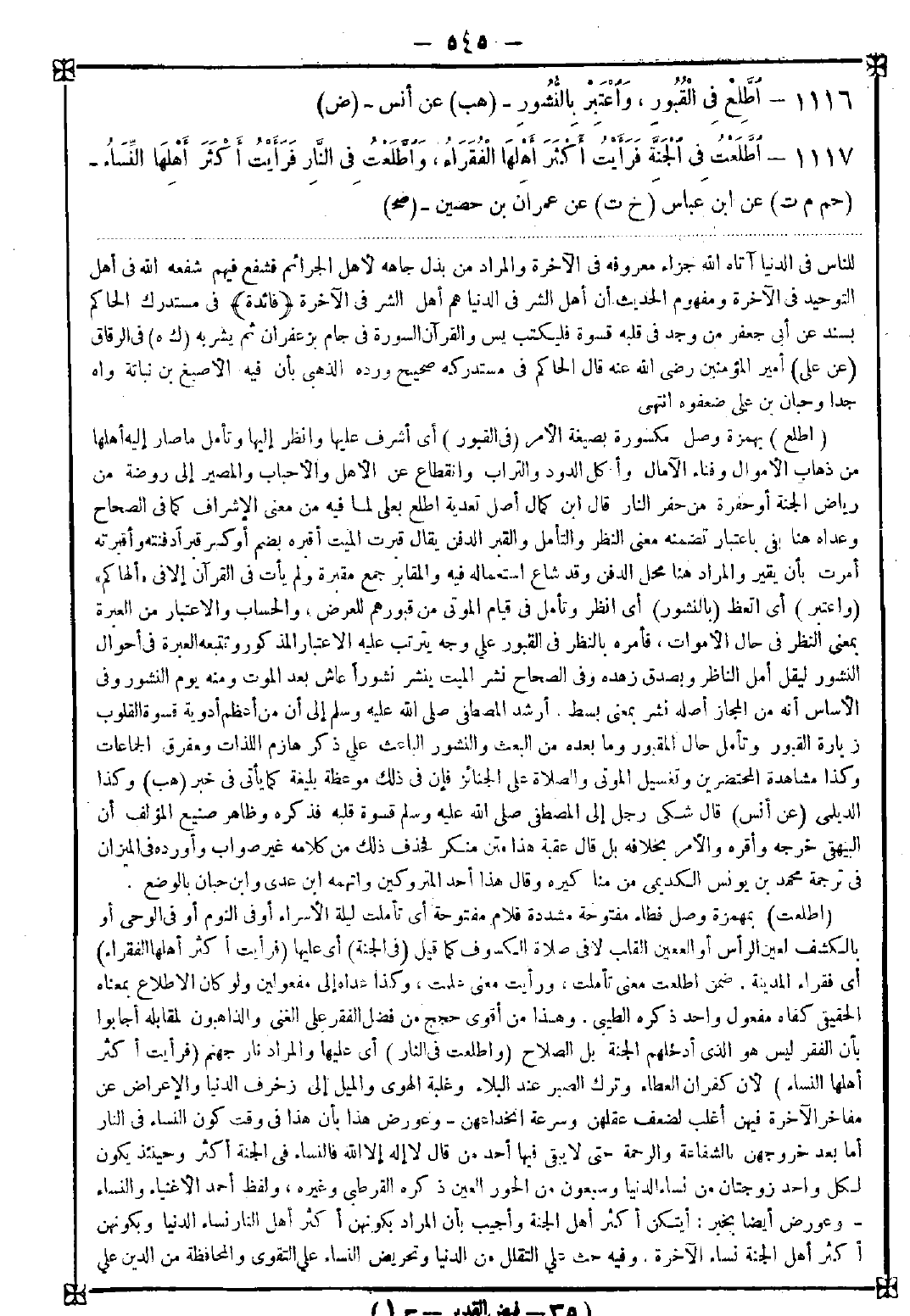 1117 - (اطلعت) بهمزة وصل فطاء مفتوحة مشدودة فلام مفتوحة أي تأملت ليلة الأسراء أو في النوم أو في الوحي أو بالكشف لعين الرأس أو لعين القلب لا في صلاة الكسوف كما قيل (في الجنة) أي عليها (فرأيت أكثر أهلها الفقراء) أي فقراء المدينة. ضمن اطلعت معنى تأملت ورأيت معنى علمت وكذا عداه إلى مفعولين ولو كان الاطلاع بمعناه الحقيقي كفاه مفعول واحد ذكره الطيبي. وهذا من أقوى حجج من فضل الفقر على الغنى والذاهبون لمقابله أجابوا بأن الفقر ليس هو الذي أدخلهم الجنة بل الصلاح (واطلعت في النار) أي عليها والمراد نار جهنم (فرأيت أكثر أهلها النساء) لأن كفران العطاء وترك الصبر عند البلاء وغلبة الهوى والميل إلى زخرف الدنيا والإعراض عن مفاخر الآخرة فيهن أغلب لضعف عقلهن وسرعة انخداعهن - وعورض هذا بأن هذا في وقت كون النساء في النار أما بعد خروجهن بالشفاعة والرحمة حتى لا يبقى فيها أحد من قال لا إله إلا الله فالنساء في الجنة أكثر وحينئذ يكون لكل واحد زوجتان من نساء الدنيا وسبعون من الحور العين ذكره القرطبي وغيره ولفظ أحمد الأغنياء والنساء - وعورض أيضا بخبر: رأيتكن أكثر أهل الجنة وأجيب بأن المراد بكونهن أكثر أهل النار نساء الدنيا وبكونهن أكثر أهل الجنة نساء الآخرة. وفيه حث على التقلل من الدنيا وتحريض النساء على التقوى والمحافظة من الدين على -[456]- السبب الأقوى وأن الجنة والنار مخلوقتان الآن خلافا لبعض المتزلة
