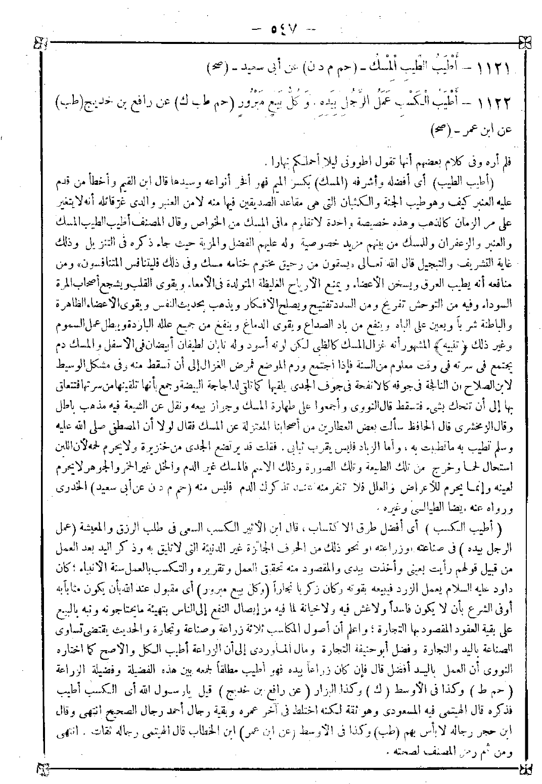 1122 - (أطيب الكسب) أي أفضل طرق الاكتساب قال ابن الأثير الكسب السعي في طلب الرزق والمعيشة (عمل الرجل بيده) في صناعته وزراعته ونحو ذلك من الحرف الجائرة غير الدنيئة التي لا تليق به وذكر اليد بعد العمل من قبيل قولهم رأيت بعيني وأخذت بيدي والمقصود منه تحقيق العمل وتقريره والتكسب بالعمل سنة الأنبياء كان داود عليه السلام يعمل الزرد فيبيعه بقوته وكان زكريا نجارا (وكل بيع مبرور) أي مقبول عند الله بأن يكون مثابا به أو في الشرع بأن لا يكون فاسدا ولا غش فيه ولا خيانة لما فيه من إيصال النفع إلى الناس بتهيئة ما يحتاجونه ونبه بالبيع على بقية العقود المقصود بها التجارة واعلم أن أصول المكاسب ثلاثة زراعة وصناعة وتجارة والحديث يقتضي تساوي الصناعة باليد والتجارة وفضل أبو حنيفة التجارة ومال الماوردي إلى أن الزراعة أطيب الكل والأصح كما اختاره النووي أن العمل باليد أفضل قال فإن كان زراعا بيده فهو أطيب مطلقا لجمعه بين هذه الفضيلة وفضيلة الزراعة