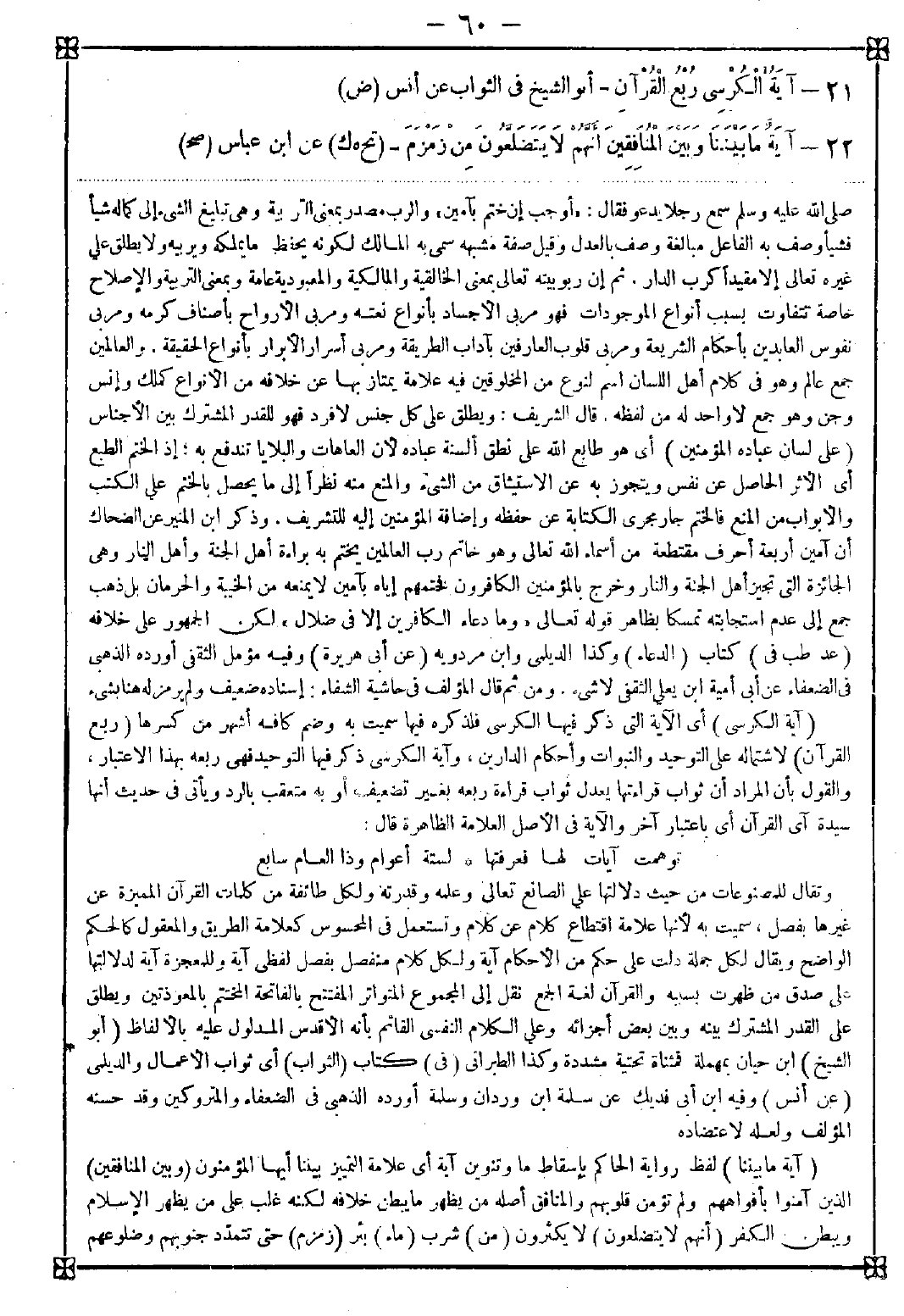 21 - (آية الكرسي) أي الآية التي ذكر فيها الكرسي فلذكره فيها سميت به وضم كافه أشهر من كسرها (ربع القرآن) لاشتماله على التوحيد والنبوات وأحكام الدارين وآية الكرسي ذكر فيها التوحيد فهي ربعه بهذا الاعتبار والقول بأن المراد أن ثواب قراءتها يعدل ثواب قراءة ربعه بغير تضعيف أو به متعقب بالرد ويأتي في حديث أنها سيدة آي القرآن أي باعتبار آخر والآية في الأصل العلامة الظاهرة قال: