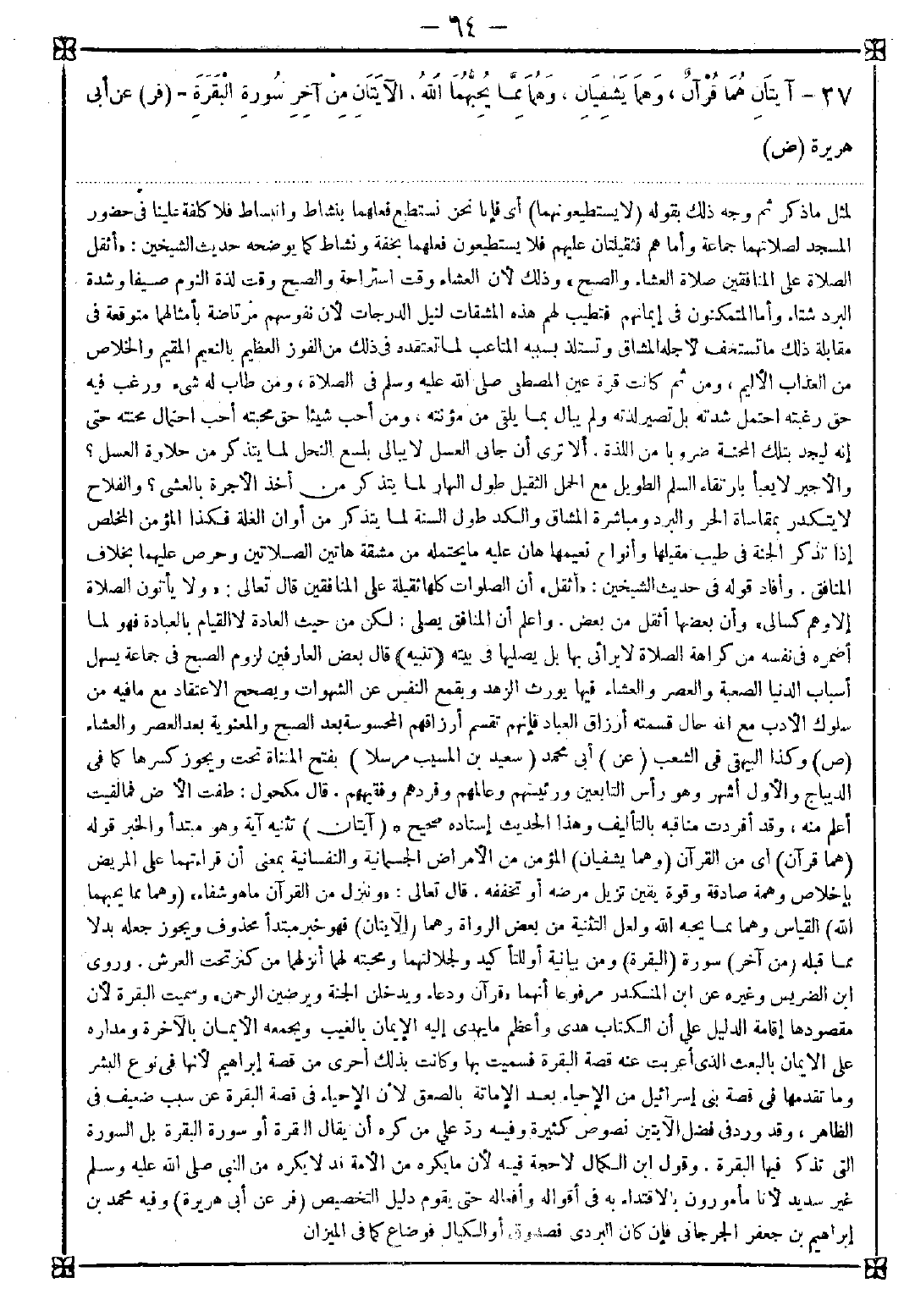 27 - (آيتان) تثنية آية وهو مبتدأ والخبر قوله (هما قرآن) أي من القرآن (وهما يشفيان) المؤمن من الأمراض الجسمانية والنفسانية بمعنى أن قراءتهما على المريض بإخلاص وهمة صادقة وقوة يقين تزيل مرضه أو تخففه. قال تعالى: {وننزل من القرآن ما هو شفاء} (وهما مما يحبهما الله) القياس وهما مما يحبه الله ولعل التثنية من بعض الرواة وهما (الآيتان) فهو خبر مبتدأ محذوف ويجوز جعله بدلا مما قبله (من آخر) سورة (البقرة) ومن بيانية أو للتأكيد ولجلالتهما ومحبته لهما أنزلهما من كنز تحت العرش. وروى ابن الضريس وغيره عن ابن المنكدر مرفوعا أنهما " قرآن ودعاء ويدخلن الجنة ويرضين الرحمن " وسميت البقرة لأن مقصودها إقامة الدليل على أن الكتاب هدى وأعظم ما يهدي إليه الإيمان بالغيب ويجمعه الأيمان بالآخرة ومداره على الإيمان بالبعث الذي أعربت عنه قصة البقرة فسميت بها وكانت بذلك أحرى من قصة إبراهيم لأنها في نوع البشر وما تقدمها في قصة بني إسرائيل من الإحياء بعد الإماتة بالصعق لأن الإحياء في قصة البقرة عن سبب ضعيف في الظاهر وقد ورد في فضل الآيتين نصوص كثيرة وفيه رد على من كره أن يقال البقرة أو سورة البقرة بل السورة التي تذكر فيها البقرة. وقول ابن الكمال لا حجة فيه لأن ما يكره من الأمة قد لا يكره من النبي صلى الله عليه وسلم غير سديد لأنا مأمورون بالإقتداء به في أقواله وأفعاله حتى يقوم دليل التخصيص