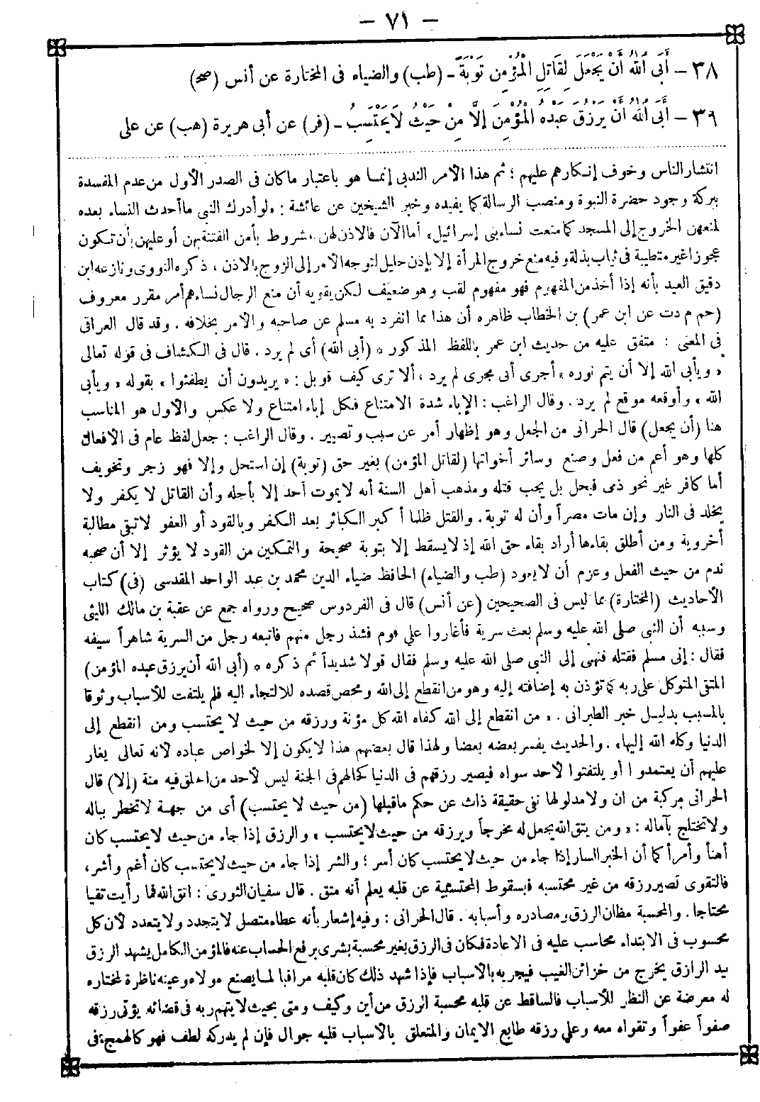 39 - (أبى الله أن يرزق عبده المؤمن) المتقي المتوكل على ربه كما تؤذن به إضافته إليه وهو من انقطع إلى الله ومحص قصده للالتجاء إليه فلم يلتفت للأسباب وثوقا بالمسبب بدليل خبر الطبراني. " من انقطع إلى الله كفاه الله كل مؤنة ورزقه من حيث لا يحتسب ومن انقطع إلى الدنيا وكله الله إليها ". والحديث يفسر بعضه بعضا ولهذا قال بعضهم هذا لا يكون إلا لخواص عباده لأنه تعالى يغار عليهم أن يعتمدوا أو يلتفتوا لأحد سواه فيصير رزقهم في الدنيا كحالهم في الجنة ليس لأحد من الخلق فيه منة (إلا) قال الحراني مركبة من أن ولا مدلولها نفي حقيقة ذات عن حكم ما قبلها (من حيث لا يحتسب) أي من جهة لا تخطر بباله ولا تختلج بآماله: {ومن يتق الله يجعل له مخرجا ويرزقه من حيث لا يحتسب} والرزق إذا جاء من حيث لا يحتسب كان أهنأ وأمرأ كما أن الخبر السار إذا جاء من حيث لا يحتسب كان أسر والشر إذا جاء من حيث لا يحتسب كان أغم وأشر فالتقوى تصير رزقه من غير محتسبه فبسقوط المحتسبية عن قلبه يعلم أنه متق. قال سفيان الثوري: اتق الله فما رأيت تقيا محتاجا. والمحسبة مظان الرزق ومصادره وأسبابه. قال الحراني: وفيه إشعار بأنه عطاء متصل لا يتجدد ولا يتعدد لأن كل محسوب في الابتداء محاسب عليه في الإعادة فكان في الرزق بغير محسبة بشرى برفع الحساب عنه فالمؤمن الكامل يشهد الرزق بيد الرازق يخرج من خزائن الغيب فيجريه بالأسباب فإذا شهد ذلك كان قلبه مراقبا لما يصنع مولاه وعينه ناظرة لمختاره له معرضة عن النظر للأسباب فالساقط عن قلبه محسبة الرزق من أين وكيف ومتى بحيث لا يتهم ربه في قضائه يؤتى رزقه صفوا عفوا وتقواه معه وعلى رزقه طابع الإيمان والمتعلق بالأسباب قلبه جوال فإن لم يدركه لطف فهو كالهمج في -[72]- المزابل يطير من مزبلة إلى مزبلة حتى يجمع أوساخ الدنيا ثم يتركها وراء ظهره وينزع ملك الموت مخالبه التي اقتنص بها الحطام ويلقى الله بإيمان سقيم دنس وينادى عليه يوم القيامة هذا جزاء من أعرض عن الله وإحسانه واتهم مولاه فلم يرض بضمانه. فتح الله لنا طريق الهداية إليه ويسر لنا منهج التوكل عليه <تنبيه> الحصر المذكور في هذا الحديث غير مراد بل المراد أن هذا هو الغالب فلا ينافي احتراف بعض الأصفياء وقد كان زكريا نجارا وإدريس خياطا وداود زرديا وفي حديث سيجئ: " وجعل رزقي تحت ظل رمحي " وكان أبو بكر تاجرا قال بعض الصوفية المراد بالرزق هنا ما يشمل المعنوي كالعلوم والمعارف