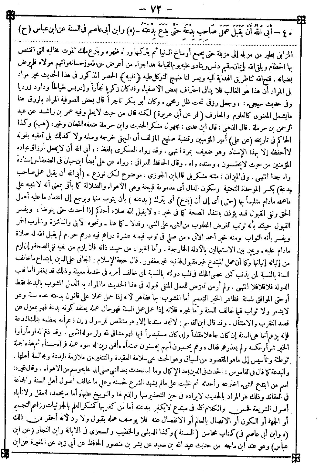 40 - (أبى الله أن يقبل عمل صاحب بدعة) بكسر الموحدة التحتية وسكون الدال أي مذمومة قبيحة وهي الأهواء والضلالة كما يأتي بمعنى أنه لا يثنيه على ما عمله ما دام متلبسا بها (حتى) أي إلى أن (يدع) أي يترك (بدعته) بأن يتوب منها ويرجع إلى اعتقاد ما عليه أهل الحق ونفي القبول قد يؤذن بانتفاء الصحة كما في خبر: " لا يقبل الله صلاة أحدكم إذا أحدث حتى يتوضأ " ويفسر القبول حينئذ بأنه ترتب الغرض المطلوب من الشيء على الشيء وقد لا - كما هنا - ونحوه الآبق والناشزة وشارب الخمر ويفسر بأنه الثواب ومنه خبر أحمد الآتي " من صلى في ثوب قيمته عشرة دراهم فيه درهم حرام لم يقبل الله له صلاة مادام عليه " ويميز بين الاستعمالين بالأدلة الخارجية. وأما القبول من حيث ذاته فلا يلزم من نفيه نفي الصحة وإن لزم من إثباته إثباتها وكما أن عمل المبتدع غير مقبول فذنبه غير مغفور. قال حجة الإسلام: الجاني على الدين بابتداع ما خالف السنة بالنسبة لمن يذنب كمن عصى الملك في قلب دولته بالنسبة لمن خالف أمره في خدمة معينة وذلك قد يغفر فأما قلب الدولة فلا فلا فلا انتهى. ولم أر من تعرض للعمل المنفي قبوله في هذا الحديث ما المراد به العمل المشوب بالبدعة فقط أو حتى الموافق للسنة فظاهر الخبر التعميم أما المشوب بها فظاهر لأنه إذا عمل عملا على قانون بدعته عدة سنة وهو لا يشعر ولا ثواب فيما خالف السنة وأما غيره فلأنه إذا عمل السنة فهو حال عمله يعتقد كونه بدعة فهو بمعزل عن قصد التقرب والامتثال. وقد قال ابن القاسم: لا نجد مبتدعا إلا وهو منتقص للرسول وإن زعم أنه يعظمه بتلك البدعة فإنه يزعم أنها هي السنة إن كان جاهلا مقلدا وإن كان مستبصرا فيها فهو مشاق لله ولرسوله انتهى. وقد ذم الله قوما رأوا الخير شرا وعكسه ولم يعذرهم فقال {وهم يحسبون أنهم يحسنون صنعا} {أفمن زين له سوء عمله فرآه حسنا} ثم هذه الجملة توطئة وتأسيس إلى ما هو المقصود من السياق وهو الحث على سلامة العقيدة والتنفير من ملازمة البدعة ومجالسة أهلها. والبدعة كما قال في القاموس: الحديث في الدين بعد الإكمال وما استحدث بعد النبي صلى الله عليه وسلم من الأهواء. وقال غيره: اسم من ابتدع الشيء اخترعه وأحدثه ثم غلبت على ما لم يشهد الشرع لحسنه وعلى ما خالف أصول أهل السنة والجماعة في العقائد وذلك هو المراد بالحديث لإيراده في حيز التحذير منها والذم لها والتوبيخ عليها وأما ما يحمده العقل ولا تأباه أصول الشريعة فحسن والكلام كله في مبتدع لا يكفر ببدعته أما من كفر بها كمنكر العلم بالجزئيات وزاعم التجسيم أو الجهة أو الكون أو الاتصال بالعالم أو الانفصال عنه فلا يوصف عمله بقبول ولا رد لأنه أحقر من ذلك