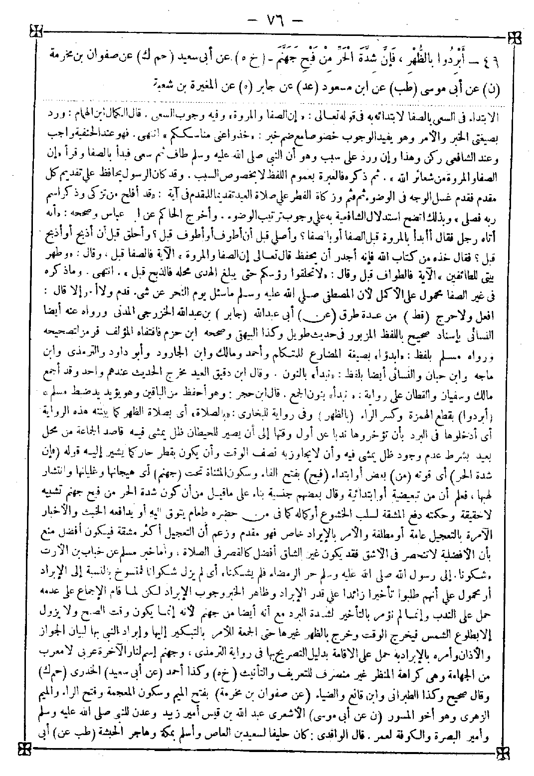 49 - (أبردوا) بقطع الهمزة وكسر الراء (بالظهر) وفي رواية للبخاري: " بالصلاة " أي بصلاة الظهر كما بينته هذه الرواية أي أدخلوها في البرد بأن تؤخروها ندبا عن أول وقتها إلى أن يصير للحيطان ظل يمشي فيه قاصد الجماعة من محل بعيد بشرط عدم وجود ظل يمشي فيه وأن لا يجاوز به نصف الوقت وأن يكون بقطر حار كما يشير إليه قوله (فإن شدة الحر) أي قوته (من) بعض أو ابتداء (فيح) بفتح الفاء وسكون المثناة تحت (جهنم) أي هيجانها وغليانها وانتشار لهبها فعلم أن من تبعيضية أو ابتدائية وقال بعضهم جنسية بناء على ما قيل من أن كون شدة الحر من فيح جهنم تشبيه لا حقيقة وحكمته دفع المشقة لسلب الخشوع أو كماله كما في من حضره طعام يتوق إليه أو يدافعه الخبث والأخبار الآمرة بالتعجيل عامة أو مطلقة والأمر بالإبراد خاص فهو مقدم وزعم أن التعجيل أكثر مشقة فيكون أفضل منع بأن الأفضلية لا تنحصر في الأشق فقد يكون غير الشاق أفضل كالقصر في الصلاة. وأما خبر مسلم عن خباب بن الأرت " شكونا إلى رسول الله صلى الله عليه وسلم حر الرمضاء فلم يشكنا " أي لم يزل شكوانا فمنسوخ بالنسبة إلى الإبراد أو محمول على أنهم طلبوا تأخير زائدا على قدر الإبراد وظاهر الخبر وجوب الإبراد لكن لما قام الإجماع على عدمه حمل على الندب وإنما لم نؤمر بالتأخير لشدة البرد مع أنه أيضا من جهنم لأنه إنما يكون وقت الصبح ولا يزول إلا بطلوع الشمس فيخرج الوقت وخرج بالظهر غيرها حتى الجمعة للأمر بالتبكير إليها وإبراد النبي بها لبيان الجواز والأذان وأمره بالإبراد حمل على الإقامة بدليل التصريح بها في رواية الترمذي وجهنم اسم لنار الآخرة عربي لا معرب من الجهامة وهي كراهة المنظر غير منصرف للتعريف والتأنيث