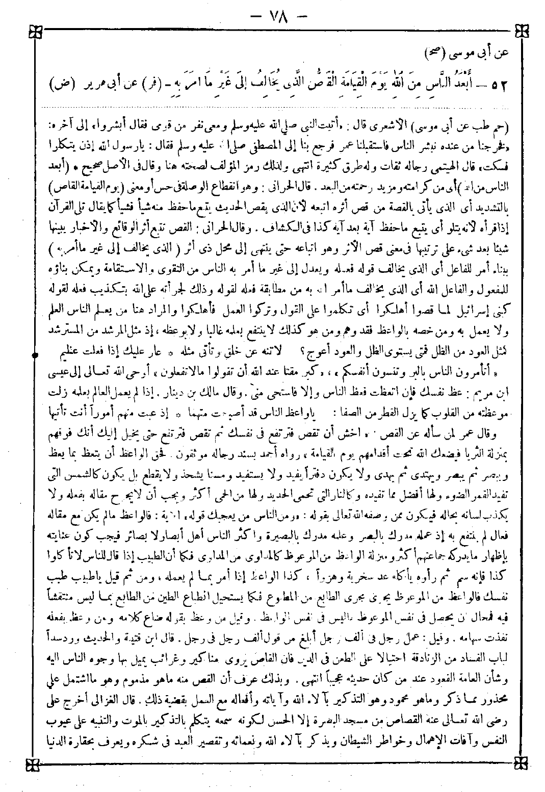 52 - (أبعد الناس من الله) أي من كرامته ومزيد رحمته من البعد. قال الحراني: وهو انقطاع الوصلة في حس أو معنى (يوم القيامة القاص) بالتشديد أي الذي يأتي بالقصة من قص أثره اتبعه لأن الذي يقص الحديث يتبع ما حفظ منه شيئا فشيئا كما يقال تلى القرآن إذا قرأه لأنه يتلو أي يتبع ما حفظ آية بعد آية كما في الكشاف. وقال الحراني: القص تتبع أثر الوقائع والأخبار يبينها شيئا بعد شيء على ترتيبها في معنى قص الأثر وهو اتباعه حتى ينتهي إلى محل ذي أثر (الذي يخالف إلى غير ما أمر به) ببناء أمر للفاعل أي الذي يخالف قوله فعله ويعدل إلى غير ما أمر به الناس من التقوى والاستقامة ويمكن بناؤه للمفعول والفاعل الله أي الذي يخالف ما أمر الله به من مطابقة فعله لقوله وذلك لجرأته على الله بتكذيب فعله لقوله كبني إسرائيل لما قصوا أهلكوا أي تكلموا على القول وتركوا العمل فأهلكوا والمراد هنا من يعلم الناس العلم ولا يعمل به ومن خصه بالواعظ فقد وهم ومن هو كذلك لا ينتفع بعلمه غالبا ولا بوعظه إذ مثل المرشد من المسترشد كمل العود من الظل فمتى يستوي الظل والعود أعوج؟