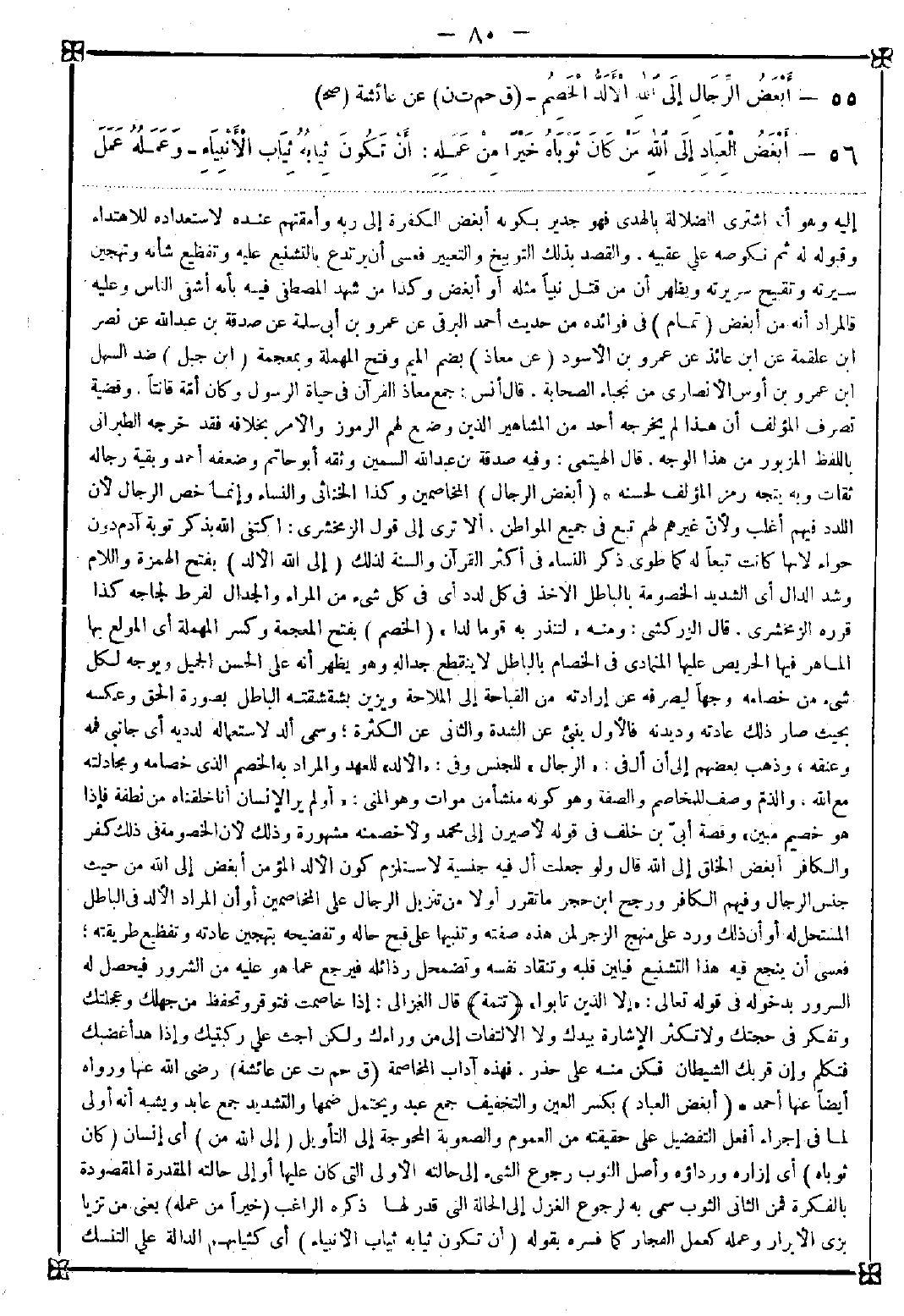 55 - (أبغض الرجال) المخاصمين وكذا الخنائي والنساء وإنما خص الرجال لأن اللدد فيهم أغلب ولأن غيرهم لهم تبع في جميع المواطن. ألا ترى إلى قول الزمخشري: اكتفى الله بذكر توبة آدم دون حواء لأنها كانت تبعا له كما طوى ذكر النساء في أكثر القرآن والسنة لذلك (إلى الله الألد) بفتح الهمزة واللام وشد الدال أي الشديد الخصومة بالباطل الآخذ في كل لدد أي في كل شيء من المراء والجدال لفرط لجاجه كذا قرره الزمخشري. قال الزركشي: ومنه {لتنذر به قوما لدا} (الخصم) بفتح المعجمة وكسر المهملة أي المولع بها الماهر فيها الحريص عليها المتمادي في الخصام بالباطل لا ينقطع جداله وهو يظهر أنه على الحسن الجميل ويوجه لكل شيء من خصامه وجها ليصرفه عن إرادته من القباحة إلى الملاحة ويزين بشقشقته الباطل بصورة الحق وعكسه بحيث صار ذلك عادته وديدنه فالأول ينبئ عن الشدة والثاني عن الكثرة وسمي ألد لاستعماله لدديه أي جانبي فمه وعتقه وذهب بعضهم إلى أن أل في: " الرجال " للجنس وفي: " الألد " للعهد والمراد به الخصم الذي خصامه ومجادلته مع الله. والذم وصف للمخاصم والصفة وهو كونه منشأ من موات وهو المني: {أولم ير الإنسان أنا خلقناه من نطفة فإذا هو خصيم مبين} وقصة أبي بن خلف في قوله لأصيرن إلى محمد ولأخصمنه مشهورة وذلك لأن الخصومة في ذلك كفر والكافر أبغض الخلق إلى الله قال ولو جعلت أل فيه جنسية لاستلزم كون الألد المؤمن أبغض إلى الله من حيث جنس الرجال وفيهم الكافر ورجح ابن حجر ما تقرر أولا من تنزيل الرجال على المخاصمين أو أن المراد الألد في الباطل المستحل له أو أن ذلك ورد على منهج الزجر لمن هذه صفته وتنبيها على قبح حاله وتفضيحه بتهجين عادته وتفظيع طريقته فعسى أن ينجع فيه هذا التشنيع فيلين قلبه وتنقاد نفسه وتضمحل رذائله فيرجع عما هو عليه من الشرور فيحصل له السرور بدخوله في قوله تعالى: {إلا الذين تابوا} (تتمة) قال الغزالي: إذا خاصمت فتوقر وتحفظ من جهلك وعجلتك وتفكر في حجتك ولا تكثر الإشارة بيدك ولا الالتفات إلى من وراءك ولكن اجث على ركبتيك وإذا هدأ غضبك فتكلم وإن قربك الشيطان فكن منه على حذر. فهذه آداب المخاصمة