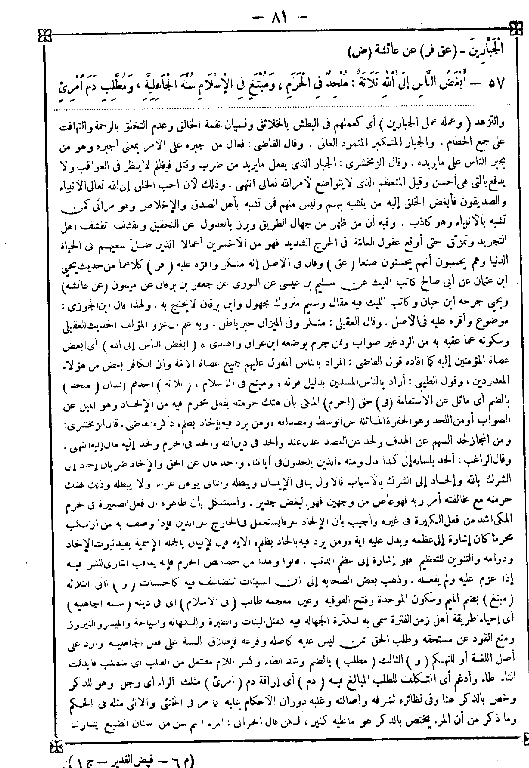 57 - (أبغض الناس إلى الله) أي أبغض عصاة المؤمنين إليه كما أفاده القاضي: المراد بالناس المقول عليهم جميع عصاة الأمة وأن الكافر أبغض من هؤلاء المعدودين وقول الطيبي: أراد بالناس المسلمين بدليل قوله " ومبتغ في الإسلام " (ثلاثة) أحدهم إنسان (ملحد) بالضم أي مائل عن الاستقامة (في) حق (الحرم) المكي بأن هتك حرمته بفعل محرم فيه من الإلحاد وهو الميل عن الصواب أو من اللحد وهو الحفرة المائلة عن الوسط ومصداقه {ومن يرد فيه بإلحاد بظلم} ذكره القاضي. قال الزمخشري: ومن المجاز لحد السهم عن الهدف ولحد عن القصد عدل عند والحد في دين الله والحد في الحرم ولحد إليه مال إليه انتهى. وقال الراغب: ألحد بلسانه إلى كذا مال ومنه {الذين يلحدون في آياتنا} واحد مال عن الحق والإلحاد ضربان إلحاد إلى الشرك بالله وإلحاد إلى الشرك بالأسباب فالأول ينافي الإيمان ويبطله والثاني يوهن عراه ولا يبطله وذلك لهتك حرمته مع مخالفته أمر ربه فهو عاص من وجهين فهو بالبغض جدير. واستشكل بأن ظاهره أن فعل الصغيرة في الحرم المكي أشد به من فعل الكبيرة في غيره واجيب بأن الإلحاد عرفا يستعمل في الخارج عن الدين فإذا وصف به من ارتكب محرما كان إشارة إلى عظمه ويدل عليه آية {ومن يرد فيه بإلحاد بظلم} الآية فإن الإتيان بالجملة الاسمية يفيد ثبوت الإلحاد ودوامه والتنوين للتعظيم فهو إشارة إلى عظم الذنب. قالوا وهذا من خصائص الحرم فإنه يعاقب الناوي للشر فيه إذا عزم عليه ولم يفعله. وذهب بعض الصحابة إلى أن السيئات تتضاعف فيه كالحسنات (و) ثاني الثلاثة (مبتغ) بضم الميم وسكون الموحدة وفتح الفوقية وعين معجمة طالب (في الإسلام) أي في دينه (سنة الجاهلية) أي إحياء طريقة أهل زمن الفترة سمي به لكثرة الجهالة فيه كقتل البنات والطيرة والكهانة والنياحة والميسر والنيروز ومنع القود عن مستحقه وطلب الحق ممن ليس عليه كأصله وفرعه فإطلاق السنة على فعل الجاهلية ورد على أصل اللغة أو للتهكم (و) الثالث (مطلب) بالضم وشد الطاء وكسر اللام مفتعل من الطلب أي متطلب فأبدلت التاء طاء وأدغم أي التكلف للطلب المبالغ فيه (دم) أي إراقة دم (امرئ) مثلث الراء أي رجل وهو للذكر وخص بالذكر هنا وفي نظائره لشرفه وأصالته وغلبة دوران الأحكام عليه كما مر في الخنثى والأنثى مثله في الحكم وما ذكر من أن المرء يختص بالذكر هو ما عليه كثير لكن قال الحراني: المرء اسم سن من سنان الضبع يشارك -[82]- الرجل فيه المرأة ويكون له فيه فضل ما " والدم " رزق البدن والأقرب إليه المحيط به ولم يقيد هنا بالمسلم اكتقاء بقوله (بغير الحق) وقيده به في رواية زيادة للبيان فخرج نحو حربي ومرتد وقاطع طريق ومهدر بأي سبب كان والقود (ليهريق) بضم أوله وهاء مفتوحة قد تسكن أي يصب (دمه) أي يقتله بنحو ذبح أو ضرب عنق بنحو سيف فيسيل دمه وخص هذه الكيفية المشتملة على إسالة الدم لكونها أغلب طرق القتل والمراد إزهاق روحه بمحدد أو مثقل أو غيرهما كنحو سم ولما كان المنع من إراقة الدم أعظم المقاصد أو هو أعظمها أعاده صريحا ولم يكتف بيهريقه وإن كفى والمراد الطلب المترتب عليه المطلوب أو ذكر الطلب ليلزم في الإهراق بالأولى ففيه مبالغة ذكره الكرماني. وإنما كان هؤلاء الثلاثة أبغض المؤمنين إليه لأنهم جمعوا بين الذنب وما يزيد به قبحا من الإلحاد وكونه في الحرم وإحداث البدعة في الإسلام وكونها من أمر الجاهلية وقتل نفس لا لغرض بل بمجرد كونه قتلا ويزيد القبح في الأول باعتبار المحل وفي الثاني باعتبار الفاعل وفي الثالث باعتبار الفعل. قال القاضي: القاتل بغير حق يقصد ما كرهه الله من وجهين من حيث كونه ظلما والظلم على الإطلاق مكروه مبغوض ومن حيث كونه يتضمن موت العبد ومساءته والله يكره مساءته فلذلك استحق مزيد المقت وفي كل من لفظتي المبتغى والمطلب مبالغة أخرى وذلك لأن هذا الوعيد إذا ترتب على الطالب والمتمني فكيف بالمباشر