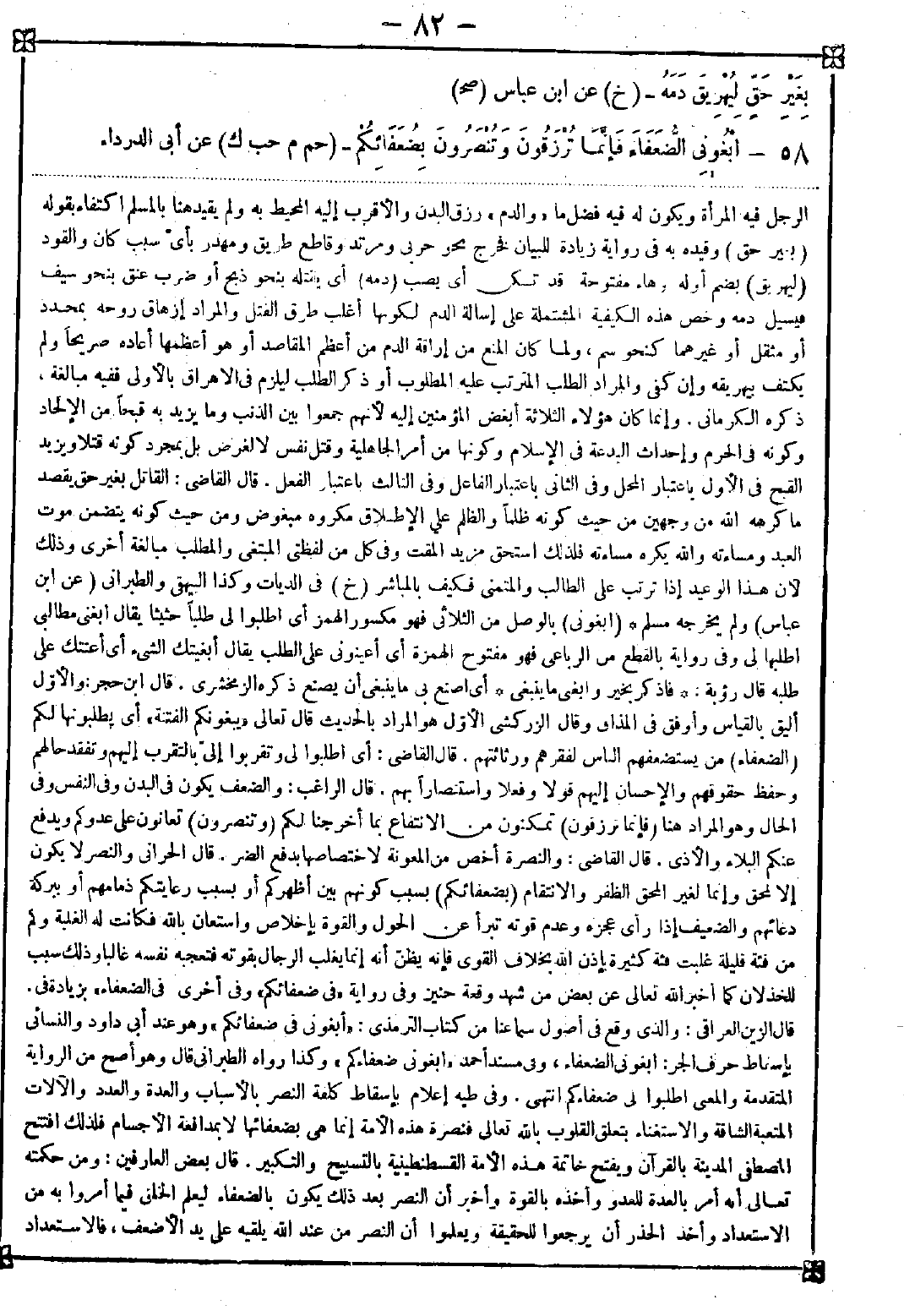 58 - (ابغوني) بالوصل من الثلاثي فهو مكسور الهمز أي اطلبوا لي طلبا حثيثا يقال ابغني مطالبي اطلبها لي وفي رواية بالقطع من الرباعي فهو مفتوح الهمزة أي أعينوني على الطلب يقال أبغيتك الشيء أي أعنتك على طلبه قال رؤية:. . . فاذكر بخير وابغني ما ينبغي. . . أي اصنع بي ما ينبغي أن يصنع. ذكره الزمخشري. قال ابن حجر: والأول أليق بالقياس وأوفق في المذاق وقال الزركشي الأول هو المراد بالحديث قال تعالى {يبغونكم الفتنة} أي يطلبونها لكم (الضعفاء) من يستضعفهم الناس لفقرهم ورثاثتهم. قال القاضي: أي اطلبوا لي وتقربوا إلي بالتقرب إليهم وتفقد حالهم وحفظ حقوقهم والإحسان إليهم قولا وفعلا واستنصارا بهم. قال الراغب: والضعف يكون في البدن وفي النفس وفي الحال وهو المراد هنا (فإنما ترزقون) تمكنون من الانتفاع بما أخرجنا لكم (وتنصرون) تعانون على عدوكم ويدفع عنكم البلاء والأذى. قال القاضي: والنصرة أخص من المعونة لاختصاصها بدفع الضر. قال الحراني والنصر لا يكون إلا لمحق وإنما لغير المحق الظفر والانتقام (بضعفائكم) بسبب كونهم بين أظهركم أو بسبب رعايتكم ذمامهم أو ببركة دعائهم والضعيف إذا رأى عجزه وعدم قوته تبرأ عن الحول والقوة بإخلاص واستعان بالله فكانت له الغلبة وكم من فئة قليلة غلبت فئة كثيرة بإذن الله بخلاف القوي فإنه يظن أنه إنما يغلب الرجال بقوته فتعجبه نفسه غالبا وذلك سبب للخذلان كما أخبر الله تعالى عن بعض من شهد وقعة حنين وفي رواية (في ضعفائكم) وفي أخرى (في الضعفاء) بزيادة في. قال الزين العراقي: والذي وقع في أصول سماعنا من كتاب الترمذي: (أبغوني في ضعفائكم) وهو عند أبي داود والنسائي بإسقاط حرف الجر: ابغوني الضعفاء وفي مسند أحمد (ابغوني ضعفاءكم) وكذا رواه الطبراني قال وهو أصح من الرواية المتقدمة والمعنى اطلبوا لي ضعفاءكم انتهى. وفي طيه إعلام بإسقاط كلمة النصر بالأسباب والعدة والعدد والآلات المتعبة الشاقة والاستغناء بتعلق القلوب بالله تعالى فنصرة هذه الأمة إنما هي بضعفائها لا بمدافعة الأجسام فلذلك افتتح المصطفى المدينة بالقرآن ويفتح خاتمة هذه الأمة القسطنطينية بالتسبيح والتكبير. قال بعض العارفين: ومن حكمته تعالى أنه أمر بالعدة للعدو وأخذه بالقوة وأخبر أن النصر بعد ذلك يكون بالضعفاء ليعلم الخلق فيما أمروا به من الاستعداد وأخذ الحذر أن يرجعوا للحقيقة ويعلموا أن النصر من عند الله يلقيه على يد الأضعف فالاستعداد -[83]- للعادة والعلم بجهة النصر في الضعيف للتوحيد وأن الأمر كله لله عادة وحقيقة يدبره كيف شاء. قال الطيبي: وفيه نهي عن مخالطة الأغنياء وتحذير من التكبر على الفقراء والمحافظة على جبر خواطرهم ولهذا قال لقمان لابنه: لا تحقرن أحدا لخلقان ثيابه فإن ربك وربه واحد. وقال ابن معاذ: حبك الفقراء من أخلاق المرسلين وإيثارك مجالستهم من علامات الصالحين وفرارك منهم من علامات المنافقين. وفي بعض الكتب الإلهية أوحى الله إلى بعض أنبيائه احذر أن أمقتك فتسقط من عيني فأصب عليك الدنيا صبا قالوا: خرج موسى يستسقي لبني إسرائيل في سبعين ألفا بعد أن أقحطوا سبع سنين فأوحى الله إليه كيف أستجيب لهم وقد أظلمت عليهم ذنوبهم سرائرهم ارجع إلى عبد من عبادي يقال له برخ وقل له يخرج حتى أستجيب له فسأل عنه موسى فلم يعرفه فبينا هو ذات يوم يمشي إذا بعبد أسود يمشي بين عينيه أثر السجود في شملة عقدها على عنقه فعرفه بنور الله فسلم عليه وقال: إنك طلبتنا منذ حين استسق لنا فخرج فقال في كلامه: ما هذا فعالك وما هذا من حلمك وما الذي بدا لك أنقصت غيوثك أم عاندت الرياح طاعتك أم نفد ما عندك أم اشتد غضبك على المذنبين ألست كنت غفارا قبل خلق الخاطئين خلقت الرحمة وأمرت بالعطف ترينا أنك ممتنع أو تخشى الفوت فتعجل بالعقوبة فما برح حتى أخصبت بنو إسرائيل بالقطر وأنبت الله العشب في نصف يوم قال حجة الإسلام فهذا عبد غلب عليه الأنس فلم ينغصه خوف التغير والحجاب فأثمر نوعا من الانبساط وذلك محتمل في مقام الأنس ومن لم يكن في مقامه وتشبه به هلك فالله الله في نفسك <تنبيه> هذا الحدي