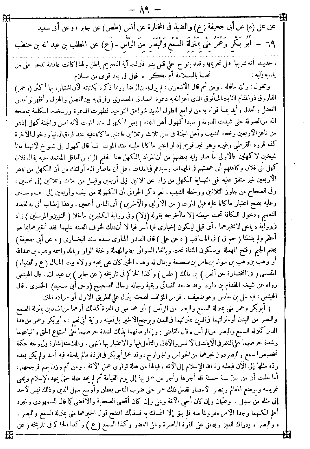 69 - (أبو بكر وعمر مني بمنزلة السمع والبصر من الرأس) أي هما مني في العزة كذلك أو هما من المسلمين بمنزلة السمع والبصر من البدن أو منزلتهما في الدين بمنزلتهما في البدن ويرجح الأخير بل تعينه رواية أبي نعيم: " أبو بكر وعمر من هذا الدين كمنزلة السمع والبصر من الرأس " قال القاضي: وإنما وصفهما بذلك لشدة حرصهما على استماع الحق واتباعهما وشدة حرصهما على النظر في الآيات في الأنفس والآفاق والتأمل فيها والاعتبار بها انتهى. وذلك منه إشارة إلى وجه حكمة تخصيص السمع والبصر دون غيرهما من الحواس والجوارح وقد عمل أبو بكر في الردة ما لم يلحقه فيه أحد ولم يكن بعده ردة مثلها إلى الآن فبعلمه رد الله الإسلام إلى الأمة فيا لها من فعلة توازي عمل الأمة. ومن ثم وزن بهم فرجحهم أما علمت أن من سن سنة حسنة فله أجرها وأجر من عمل بها إلى يوم القيامة ثم لم يجد مهلة حتى يمهد الإسلام ويجلى غريبه ويوضع المعالم ويمصر الأمصار ففعل ذلك عمر حتى ضرب الناس بعطن وأوسع منهل الدين وذلك ليس لأحد إلى مثله من سبيل. وعثمان وإن كان أحيى الأمة وعلي وإن كان أقضى الصحابة والأقضى كما قال السمهودي وغيره أعلم لكنهما وجدا الأمر مفروغا منه فلم يبق إلا التمسك به فبذلك اتضح قول الخبر هما مني بمنزلة السمع والبصر. " والبصر " إدراك العين ويطلق على القوة الباصرة وعلى العضو وكذا السمع